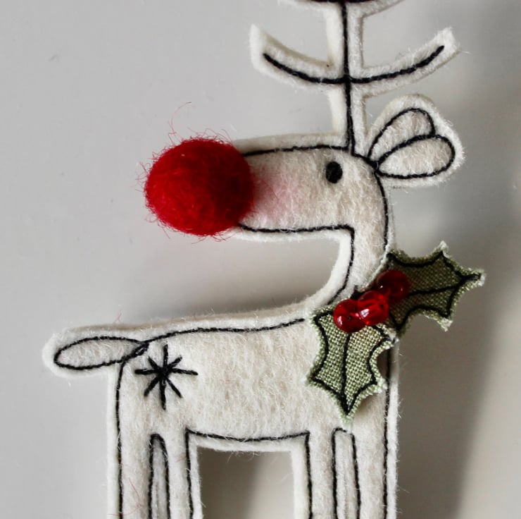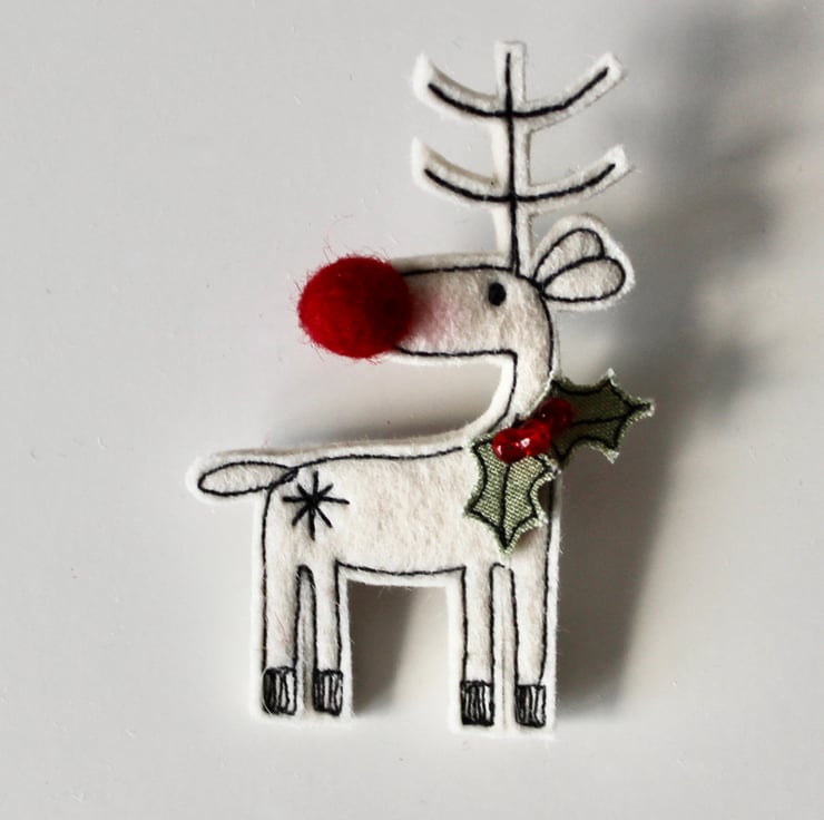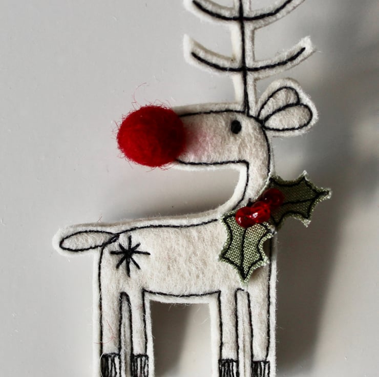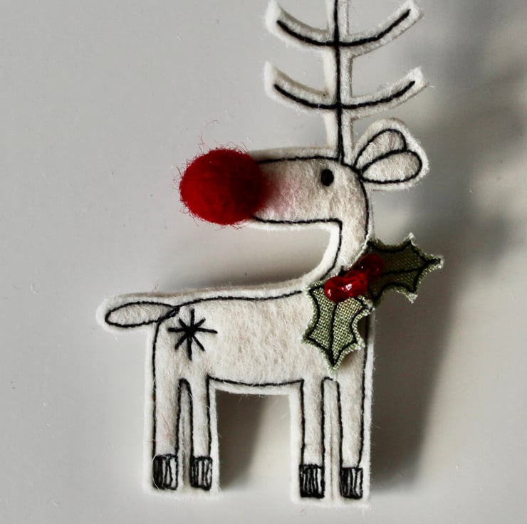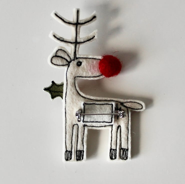 Each handmade brooch is created using 100% wool felt, cotton cloth, sewn using freehand machine embroidery and then cut out by hand. There are red glass beads as holly berries and a handmade felt ball for a nose. The pin on the back is attached with hot glue and a sewn fabric rectangle to secure.