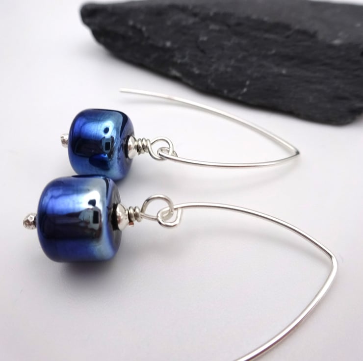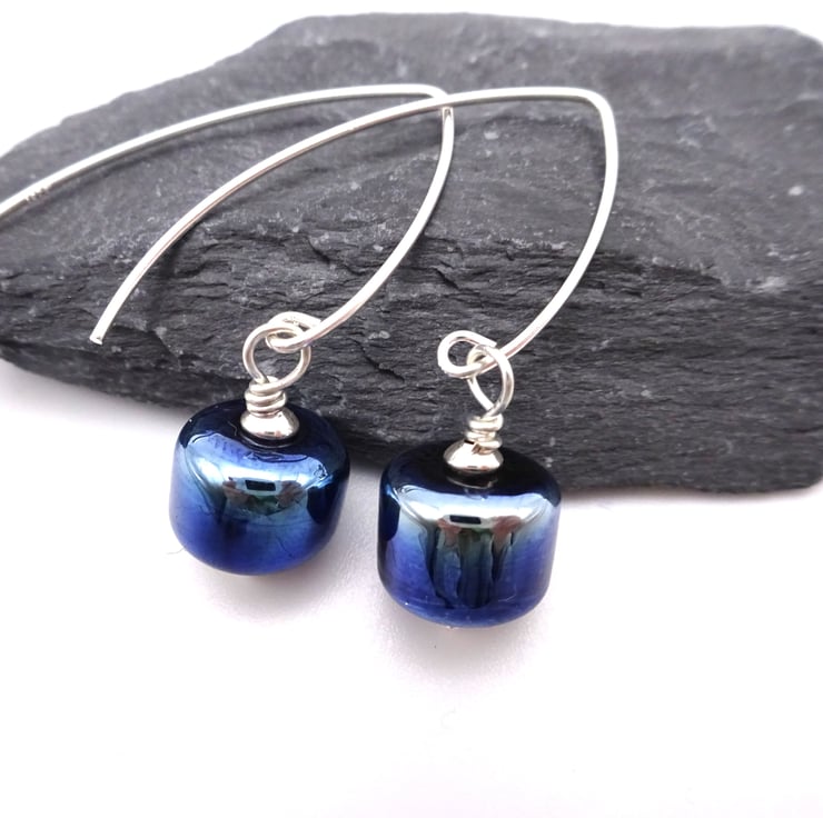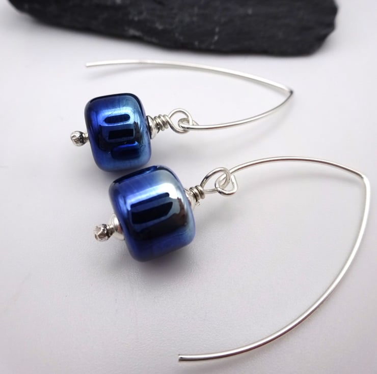 They feature handmade blue metallic lampwork glass beads and sterling silver ear wires.