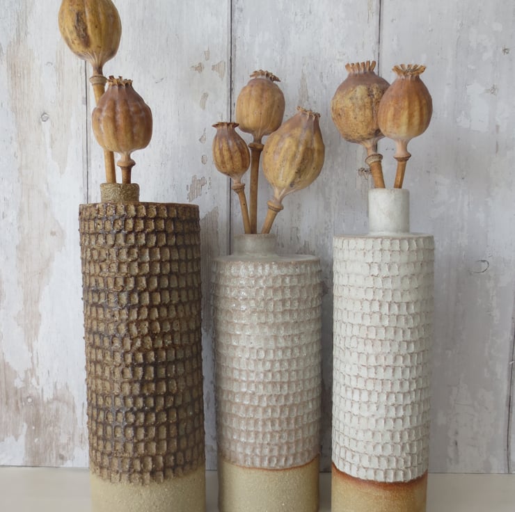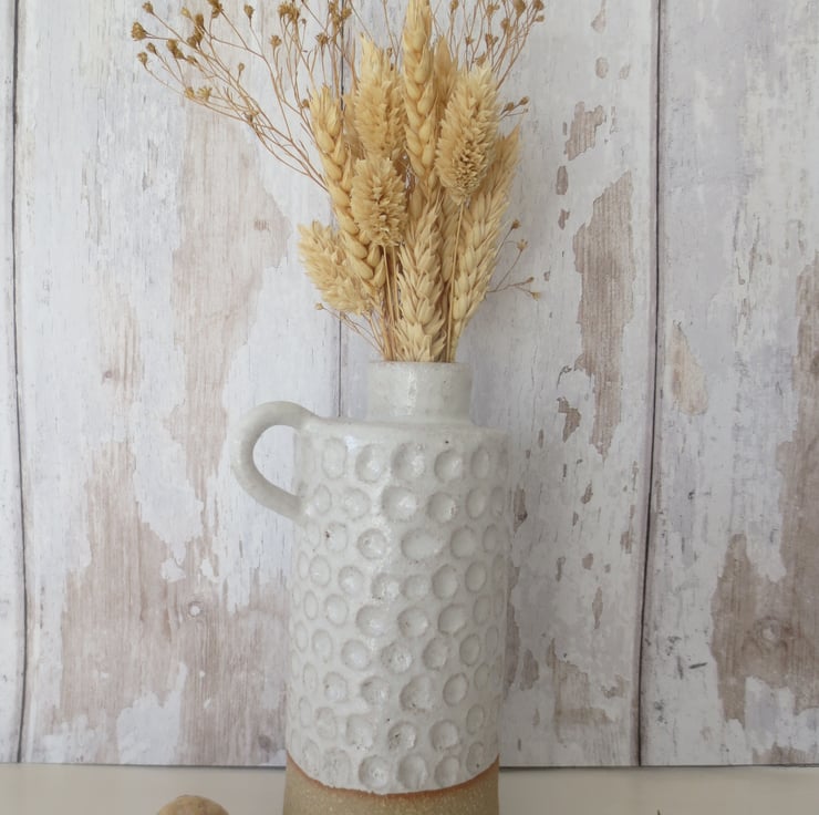 Small white dimpled bottle vase with handle