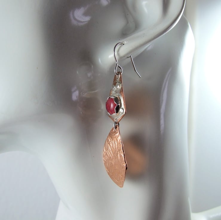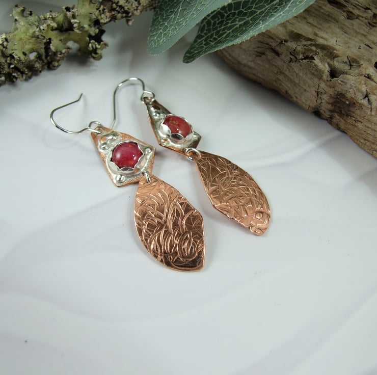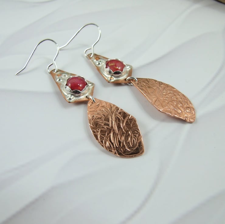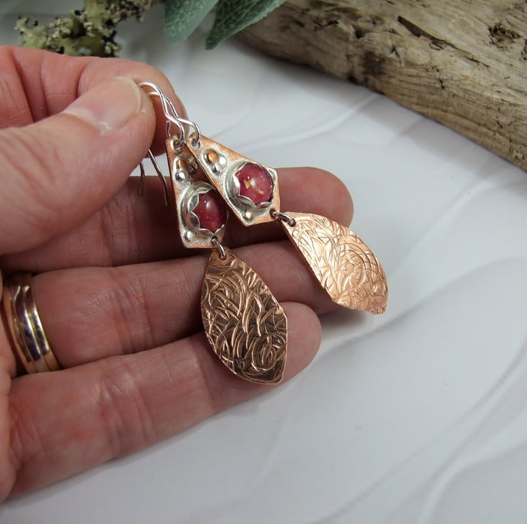 I started with the polymer clay, mixing translucent clay with ink, mica powder and gold leaf. Once the clay was cured I coated with resin for a high gloss finish and to protect the clay. The top of the earrings is made from recycled sterling silver and copper and set with the clay and resin cabachon. The dropper part has been cut by hand from copper sheet and textured with a hammer. Fitted to sterling silver ear wires.
