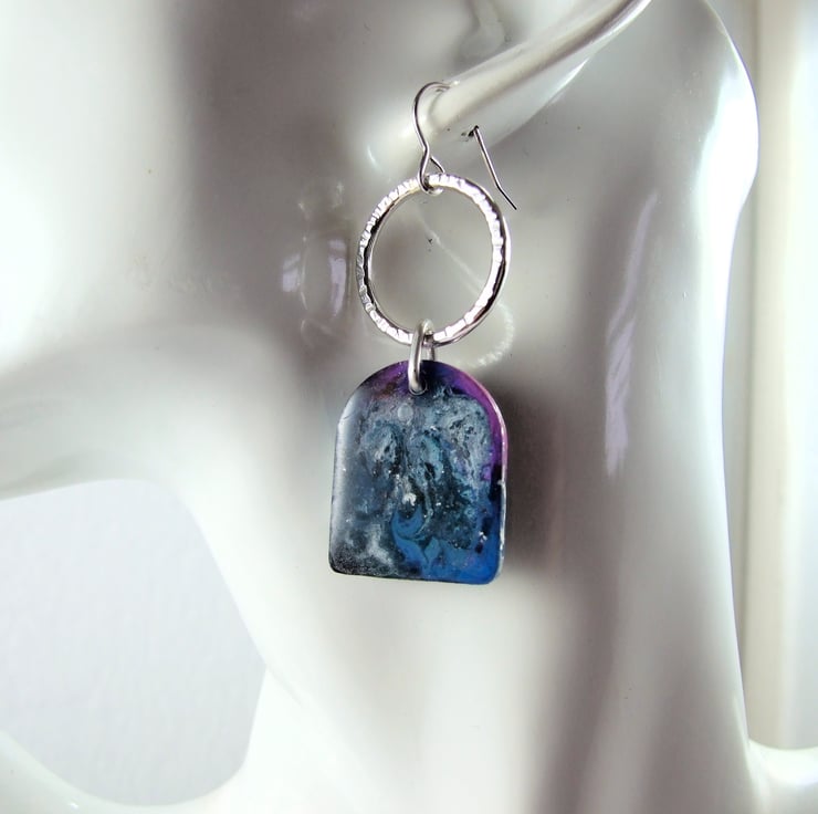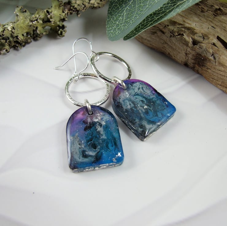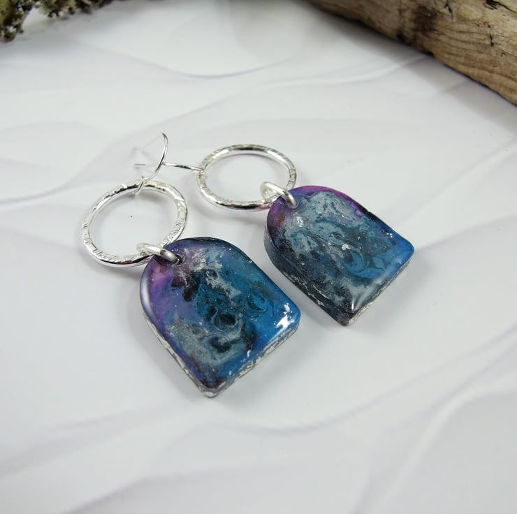 Sterling Silver Resin Art Earrings. One of a kind resin arch shape in shades of blue, purple and silver silver, edged with sterling silver leaf and paired with a silver circles and ear wire.