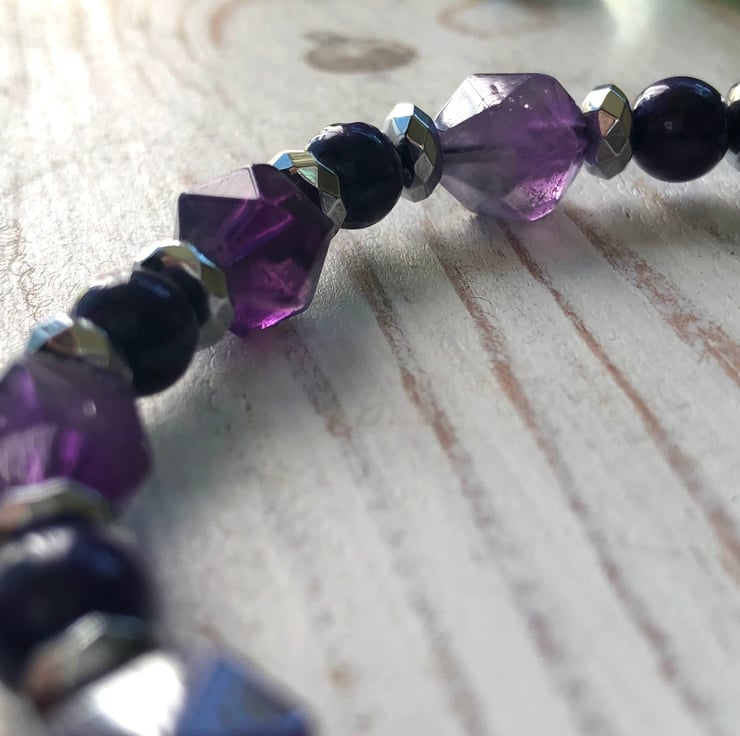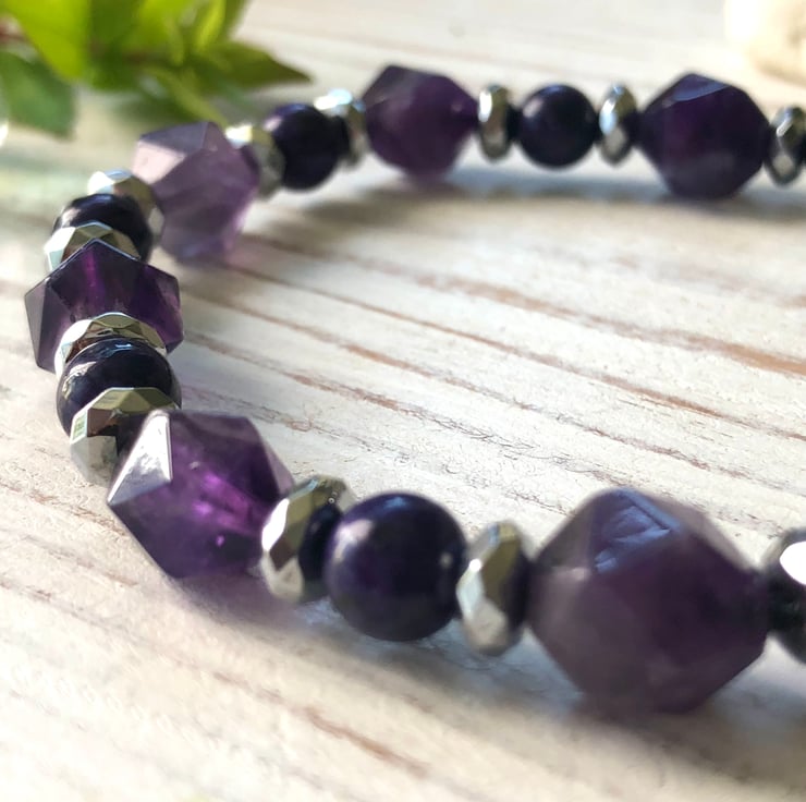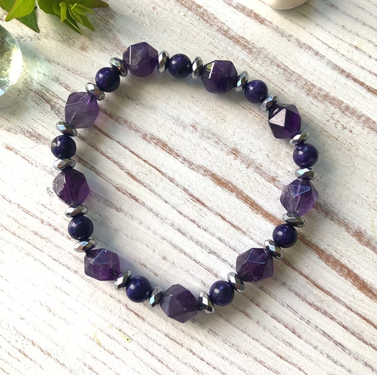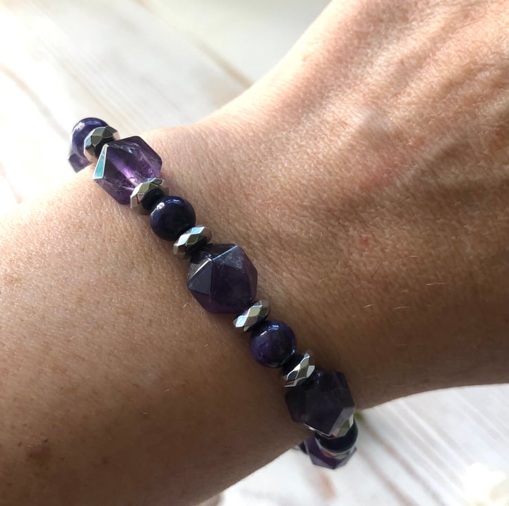 This unique elasticated stretch bracelet features Amethyst 10mm star-cut (hexagon) Amethyst & 6mm dark purple Charoite beads interspersed with faceted titanium coated hematite beads.