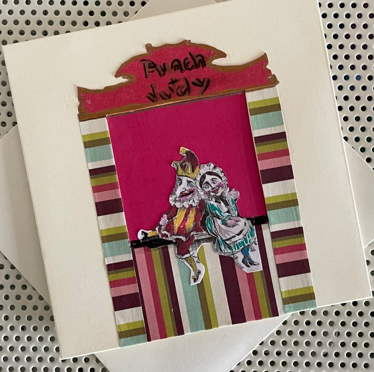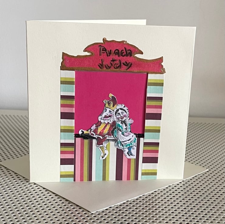 The card motif is a hand pieced collage depicting a Punch and Judy scene.