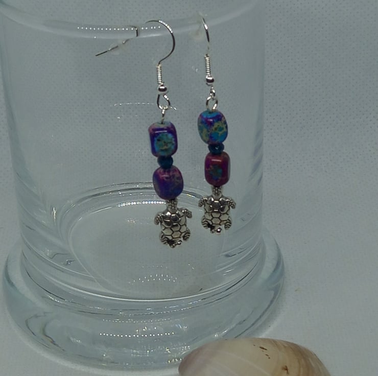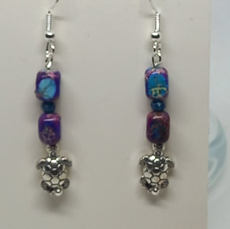 I just love turtles and these are so cute! These match the sea sediment jasper and shell necklace. Little rounded oblongs of sea sediment jasper with teal rondelles in between and the turtles keeping them company. All threaded onto silver plated ball headed pins, with silver plated ear hooks and rubber stoppers. Neatly presented on a card so would make a lovely gift or a treat for yourself. The earrings measure 1.25 inches long (not including the ear hooks)