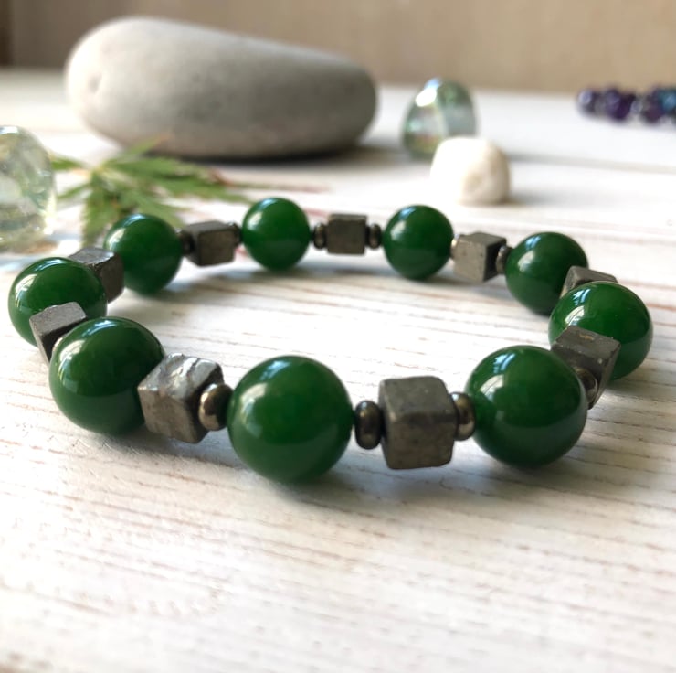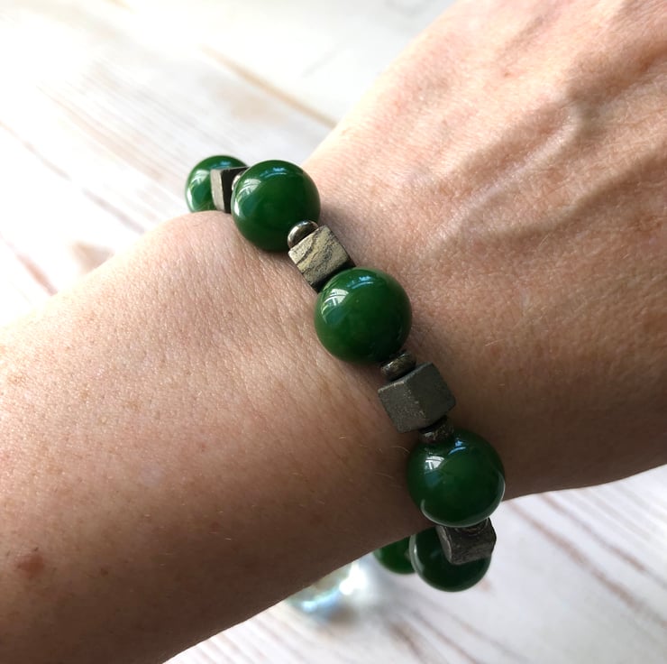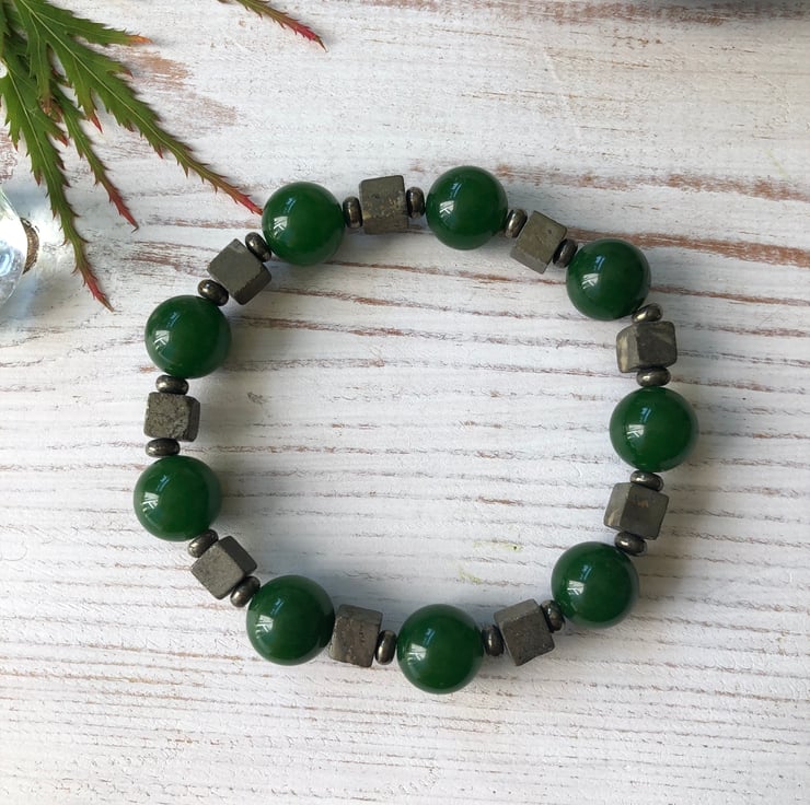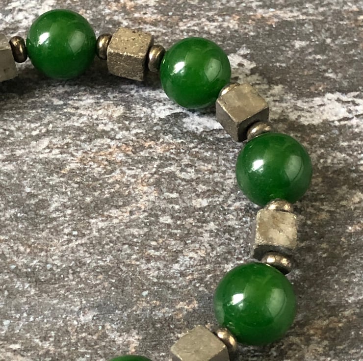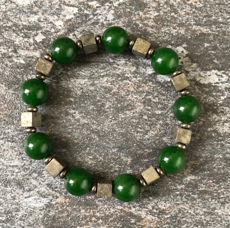 This unique chunky stretch bracelet features round 12mm dark green Jade beads and 8mm natural gold Pyrite cubes. These are interspersed with natural gold pyrite spacer beads.