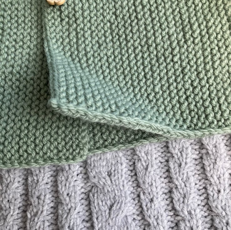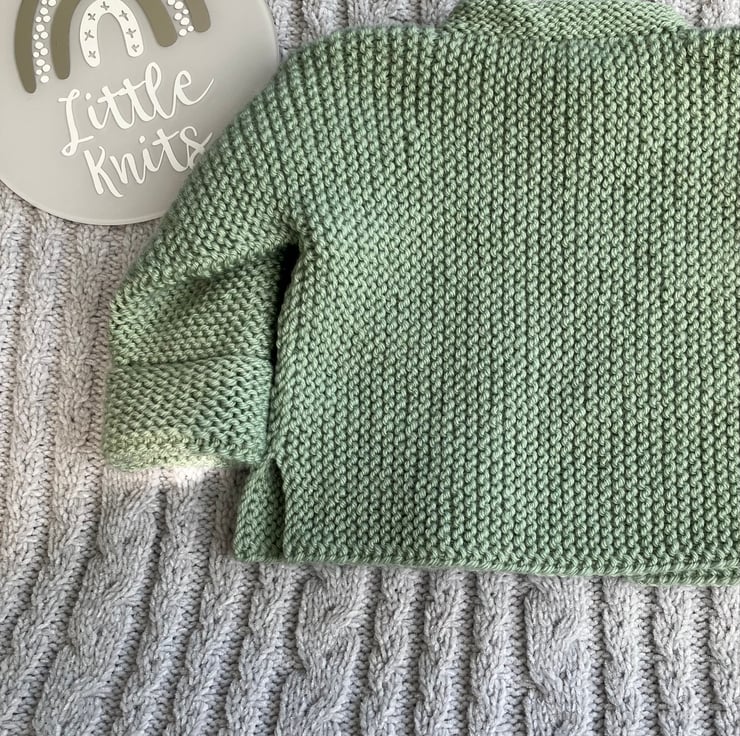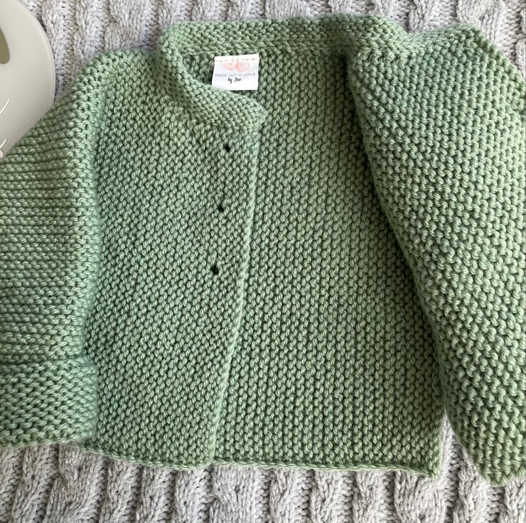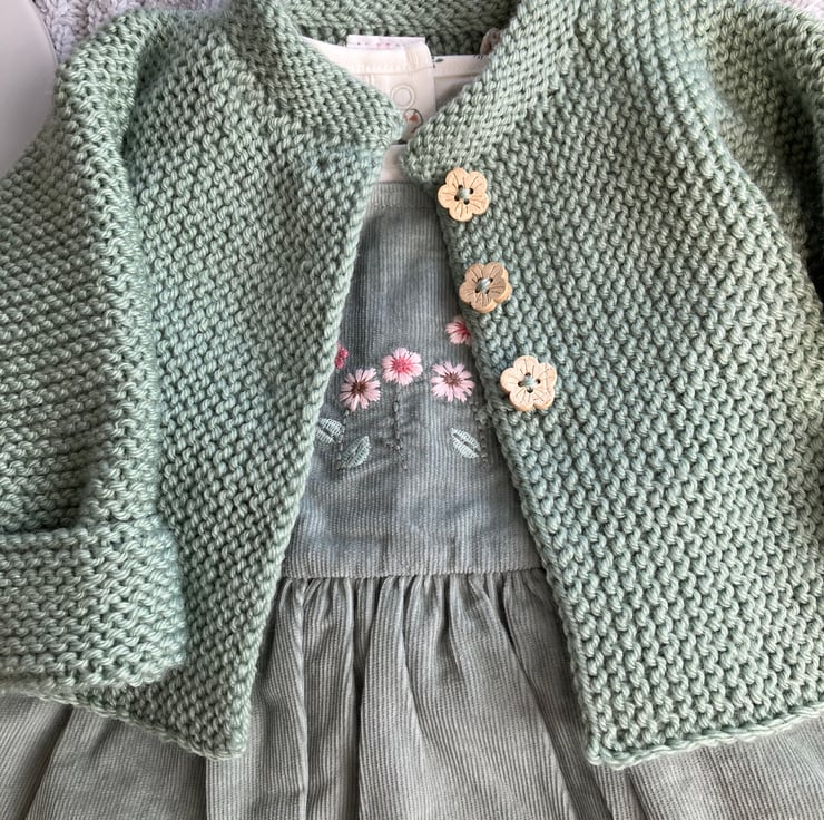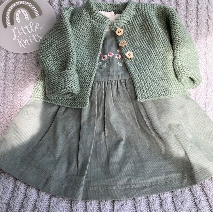I have knitted this little cardigan using a super soft premium merino/acrylic blend yarn in a very on-trend light sage green colour, with flower-shaped carved coconut shell buttons on the front fastenings. The bottom edges of the cardigan have been knitted using a fine edge stitch, giving a quality finish.