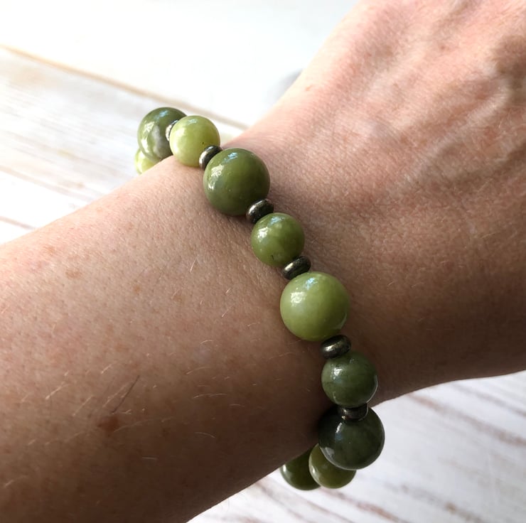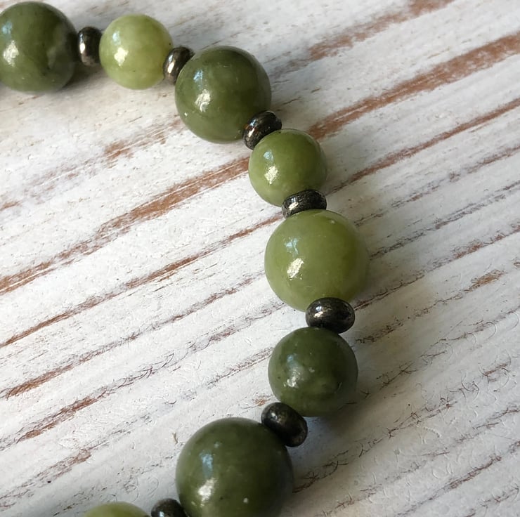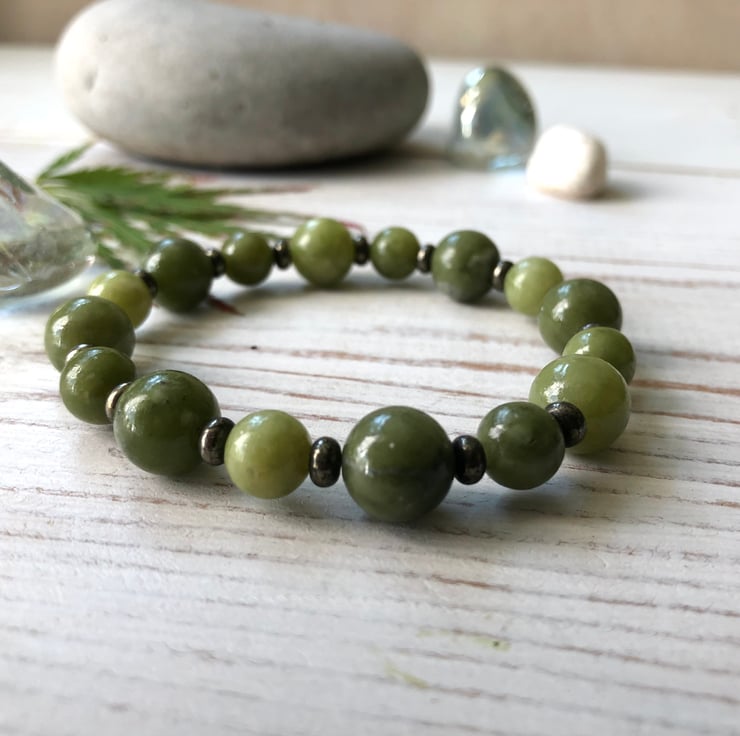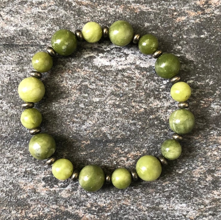 Elasticated stretch bracelet featuring natural olive green Jade beads interspersed with natural gold Pyrite spacer beads for a subtle touch of sparkle.