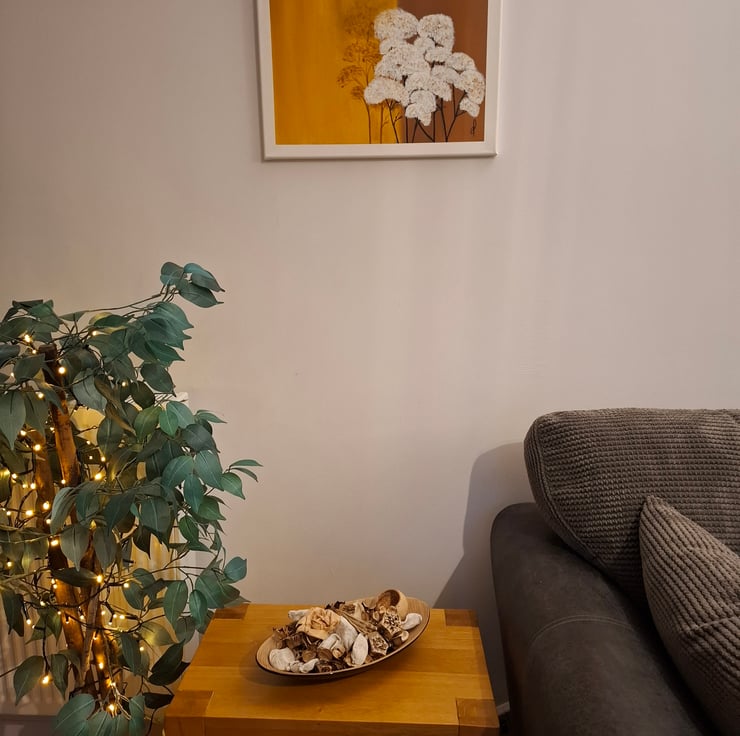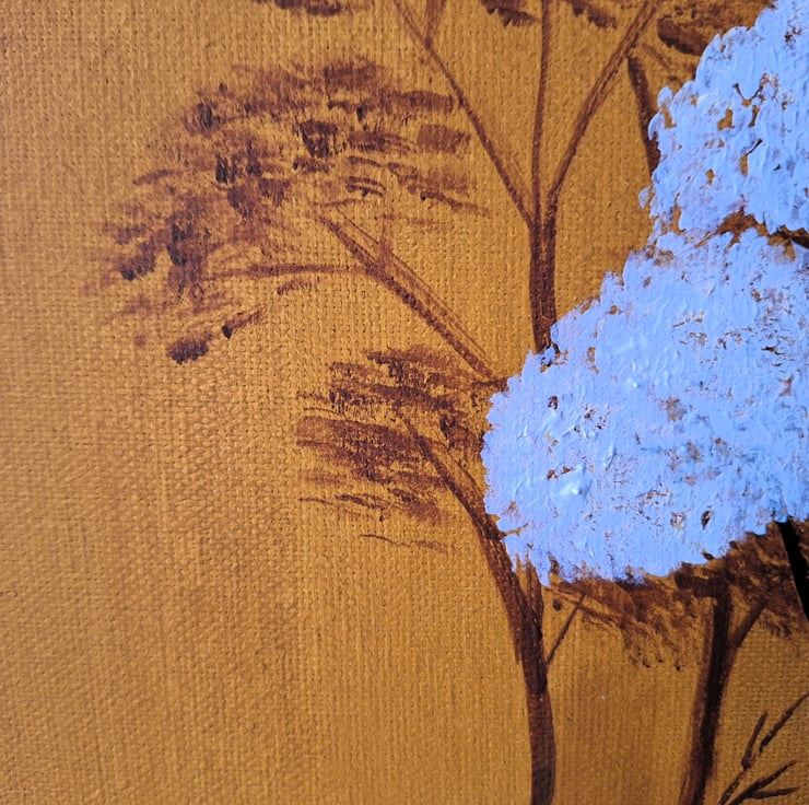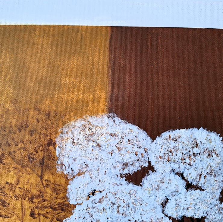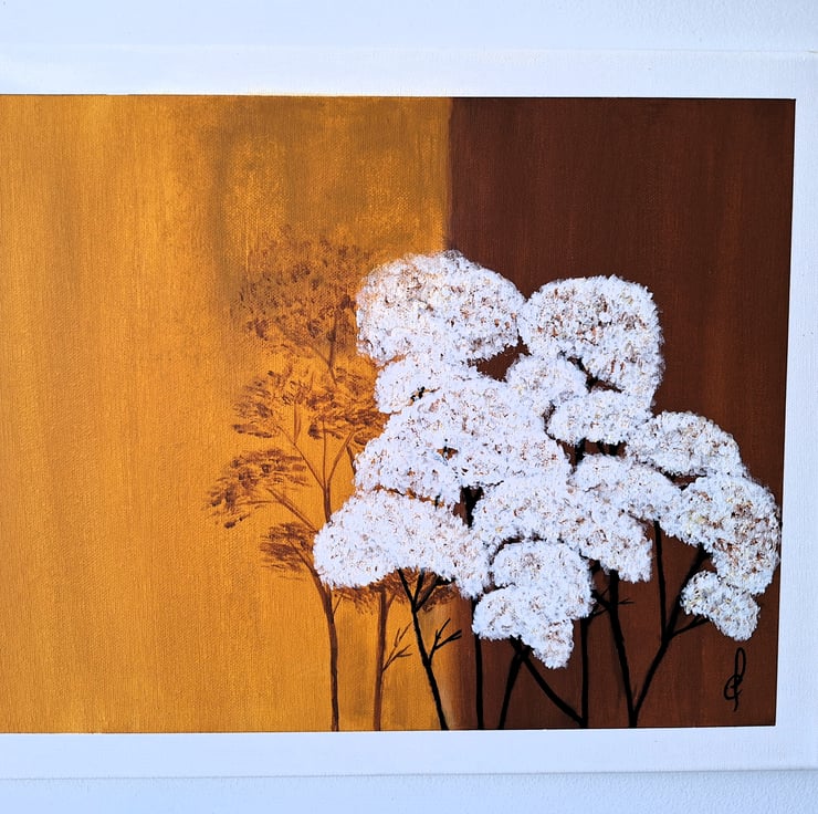 This painting has a really striking yellow ochre and sienna background which I painted slightly off centre for interest before blending the two colours together. At the forefront of the painting I used cotton buds to design the white dandelion clock like flowers and blended them with my finger. Then I painted an image of the flowers in behind to create a shadow effect. A unique and interesting artwork.