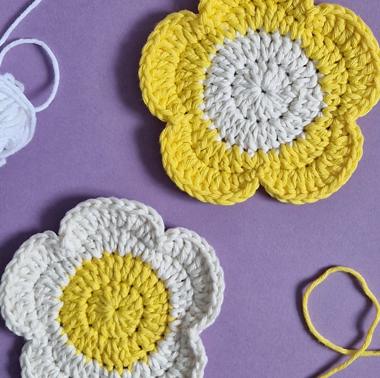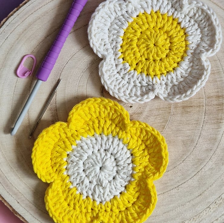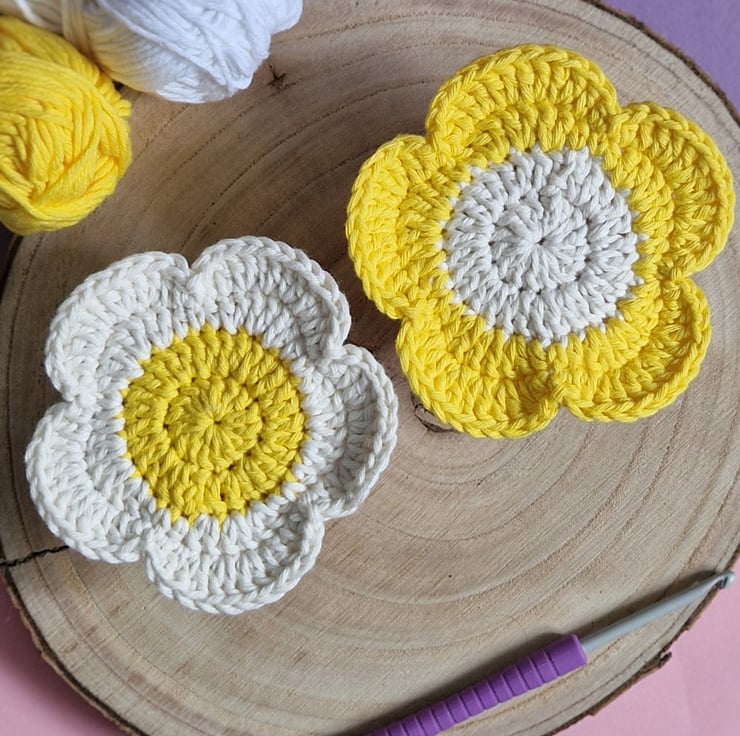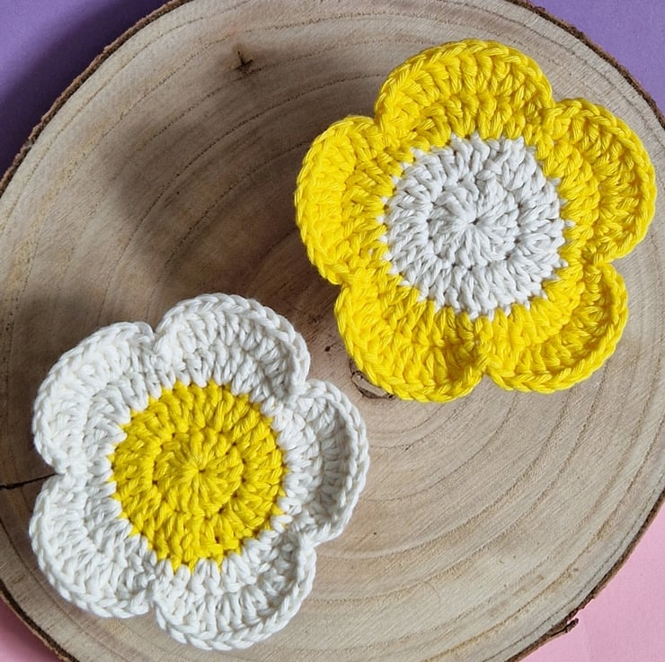 A set of two cheery flower coasters! They make colourful home decor and a wonderful house warming or birthday gift. Handmade from supersoft cotton for absorbancy from spills, they can be gently handwashed and hung to dry. If you prefer different colours, please have a look through my shop!