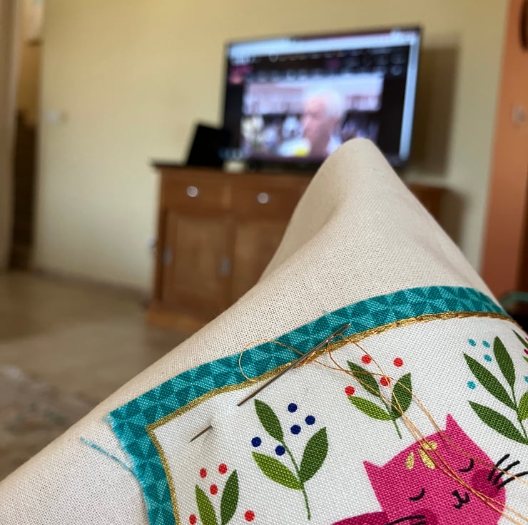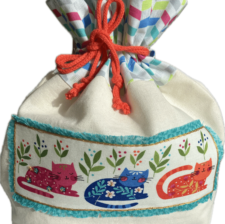 This lined draw string project bag is made using a natural unbleached cotton fabric with coordinating cotton prints. The front of the bag is embellished with a cheeky cats print which has been hand embroidered onto the bag with a gold coloured thread.