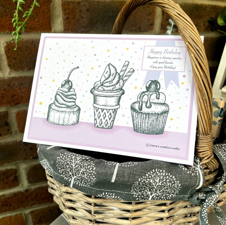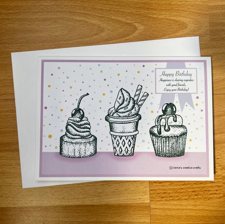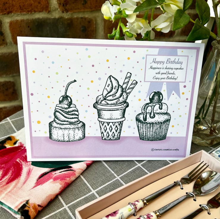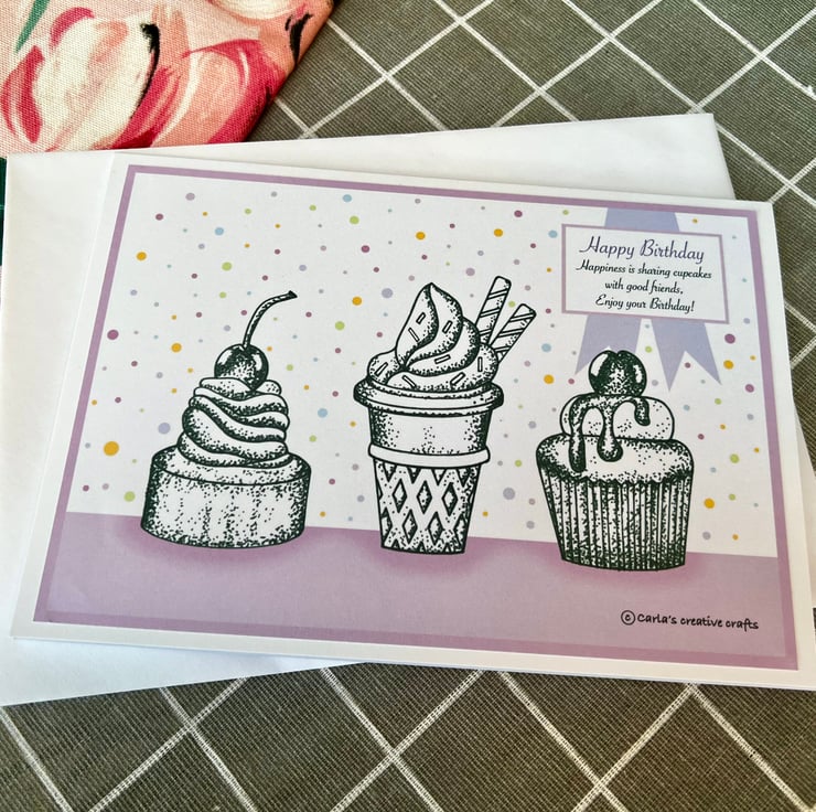 There is a ‘Happy birthday. Happiness is sharing cupcakes with good friends. Enjoy your birthday!’ message also printed on the front cover. The card is A5 in size and measures approximately 14.8cm x 21cm and includes a white envelope.