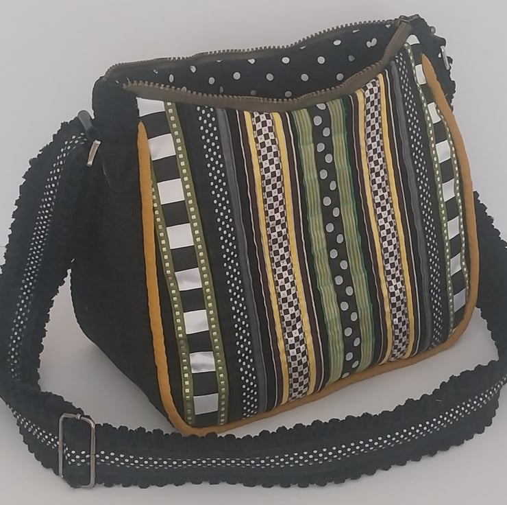 The bag fastens with a moss green zip, when open reveals a black and white cotton quilted lining, with an inside pocket (that matches the back) with makers label.