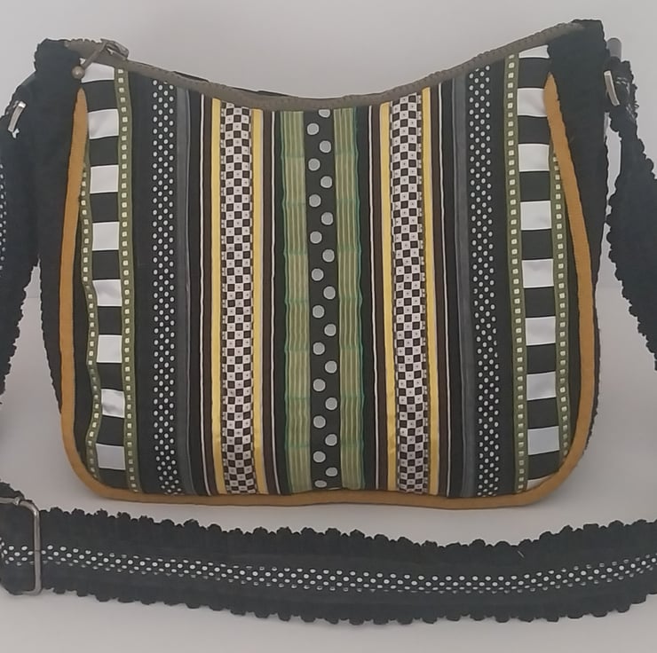 A black corduroy overlaid with different patterned and textured ribbons, to create a bold and colorful panel.