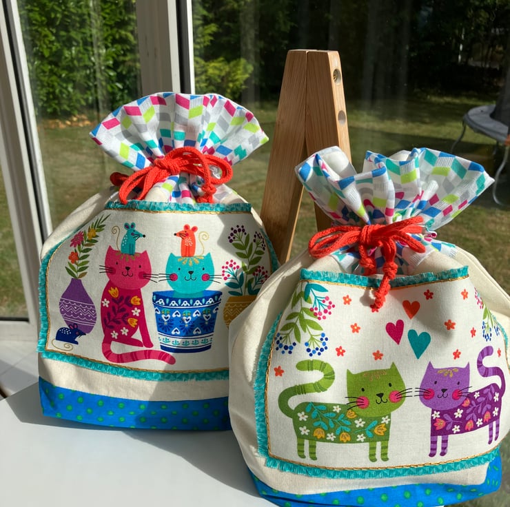This lined draw string project bag is made using a natural unbleached cotton fabric with coordinating cotton prints. The front of the bag is embellished with a cheeky cat and mouse print which has been hand embroidered onto the bag with a gold coloured thread.
