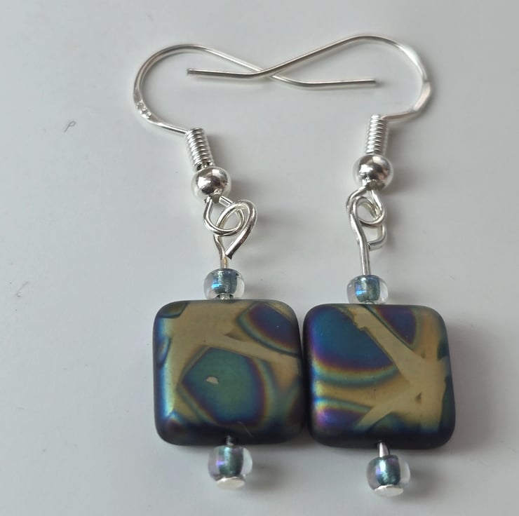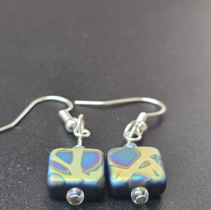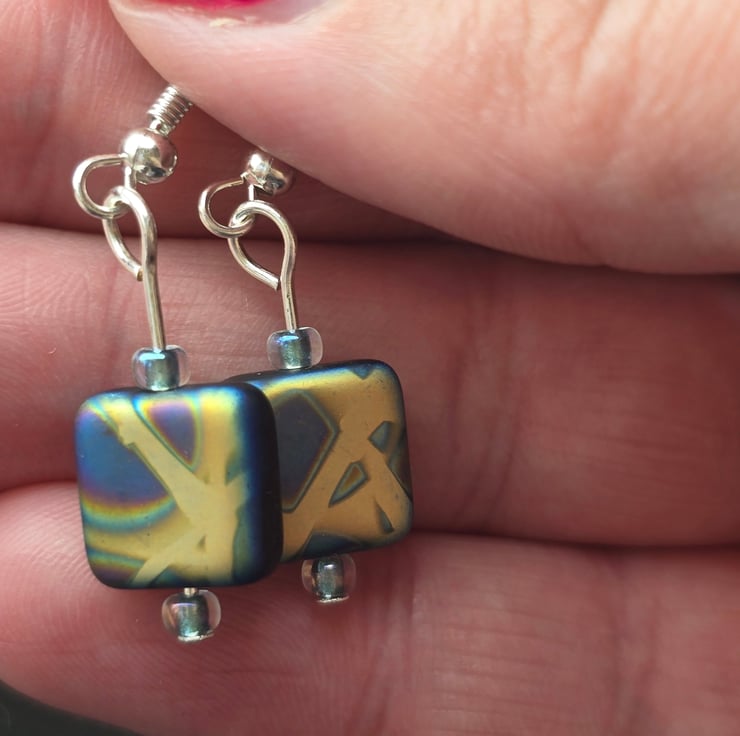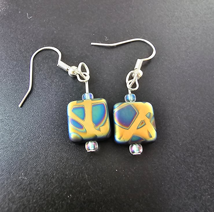 The earrings are made using Orange czech glass cubed beads which have a peacock pattern on which is multi coloured. The cubed beads do have a bit of a colour shift so you may see other colours such as yellow and blue however the main background colour is Orange.
