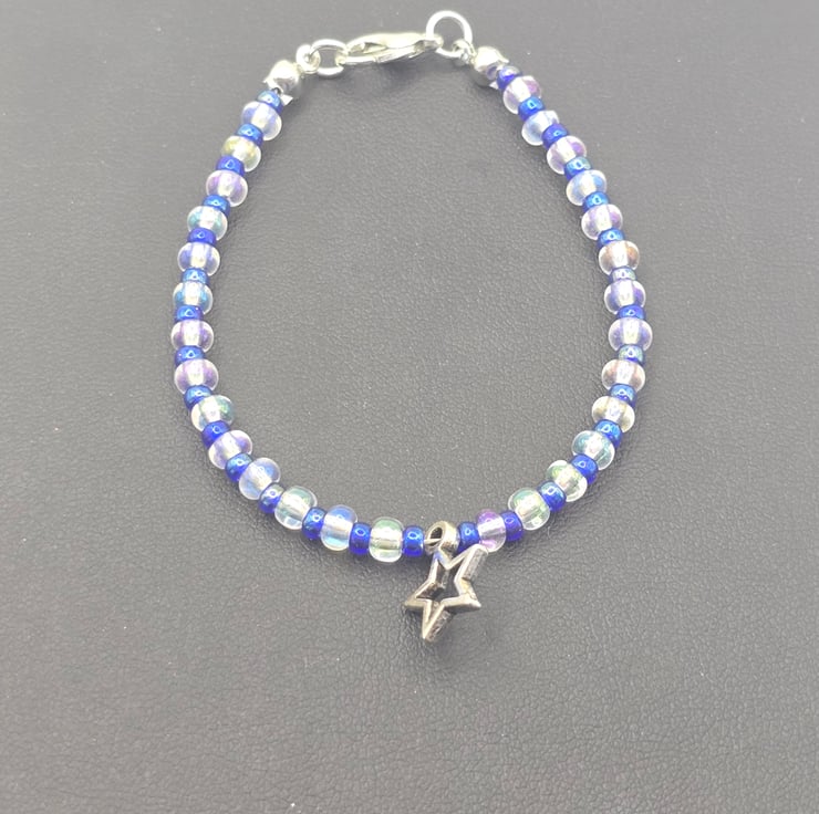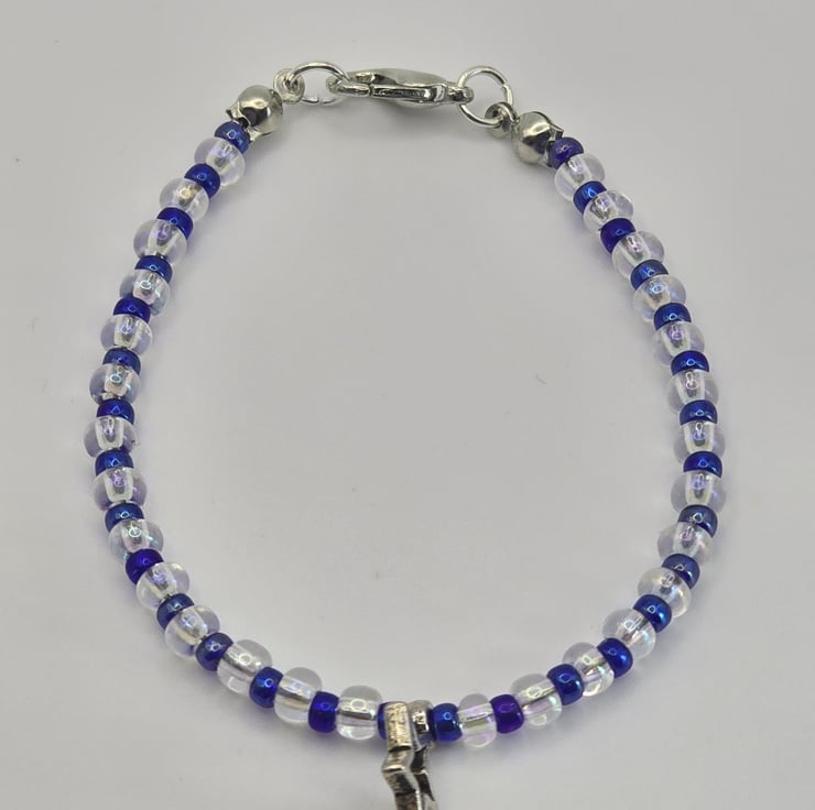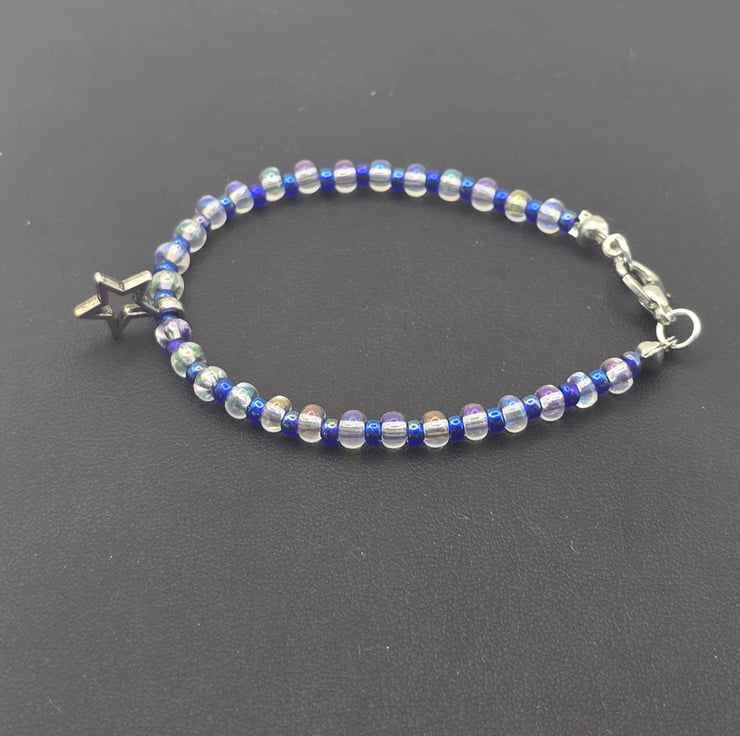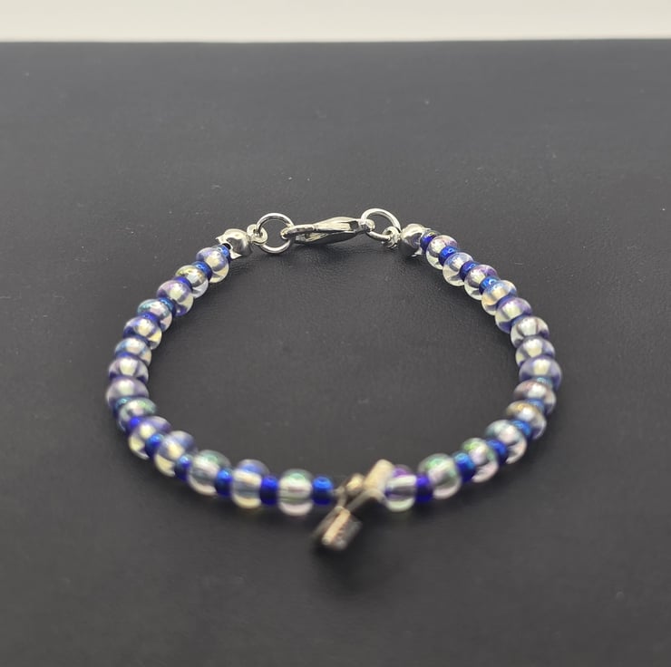 The bracelet has been made using large clear crystal AB seed beads and small dark blue seed beads with a silver metal charm in the centre of the bracelet. The beads are on a thin beading wire and fastens with a silver clasp.