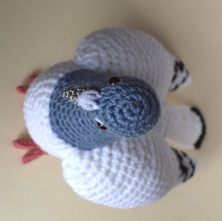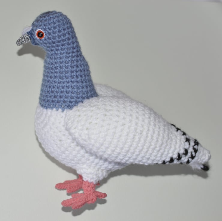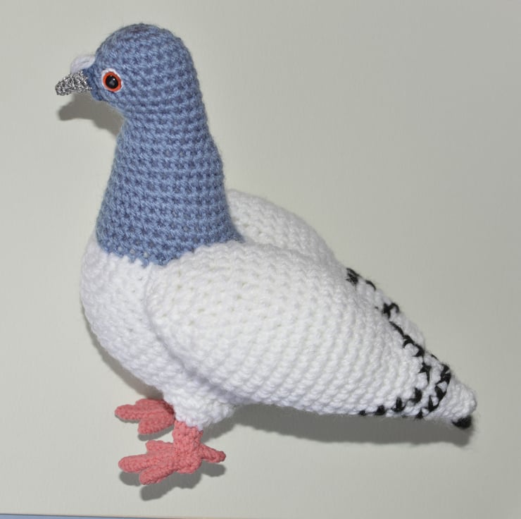 Lovely crochet pigeon hand-made by myself in a non smoking household. It measures about 8.5 inches tall x 8 inches long. This is made from acrylic, polyester and cotton yarns. It is filled with 100% polyester filling and fitted with safety eyes. Not suitable for a child under 3 years old, as although it has safety eyes they are not recommended for this age group.