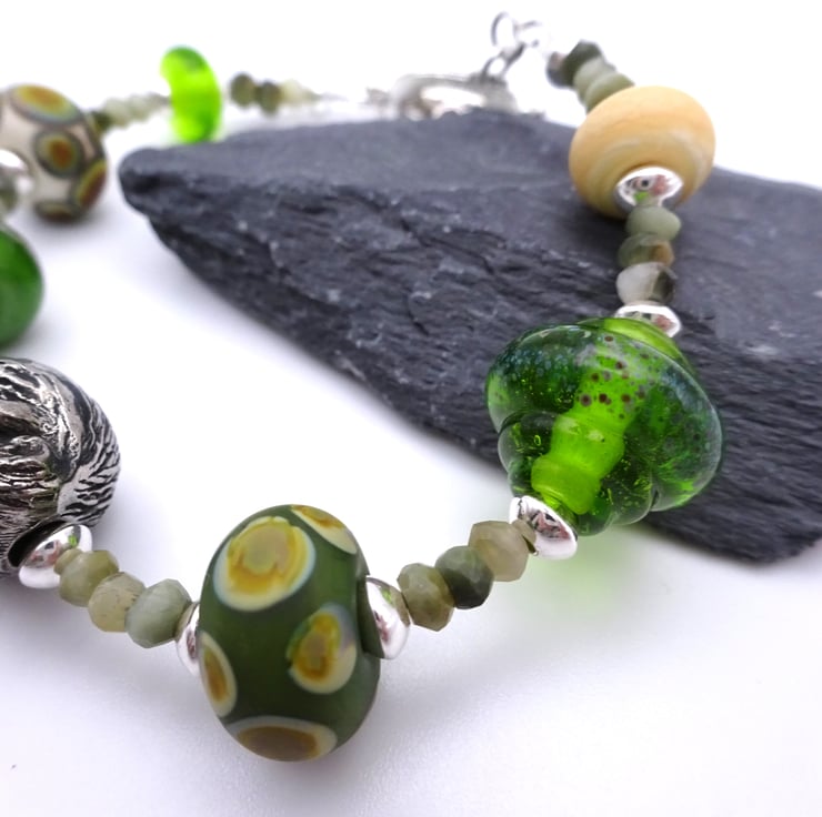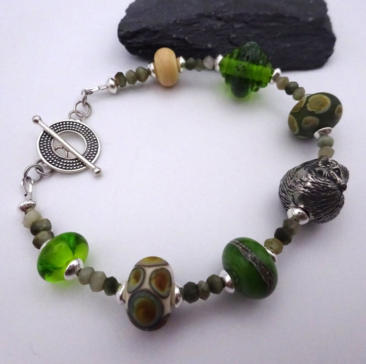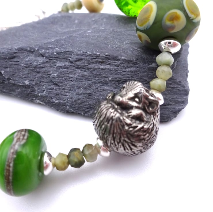 A bracelet made with green handmade lampwork glass beads, sterling silver beads, chrysoberyl gemstone beads and a handmade pewter hedgehog.