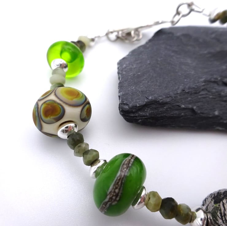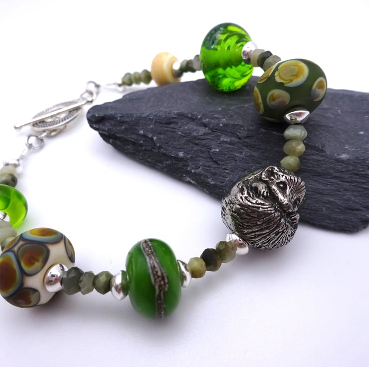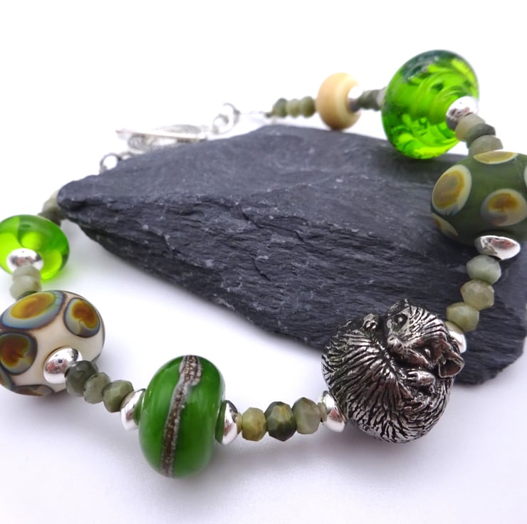 green lampwork glass beaded bracelet, hedgehog jewellery