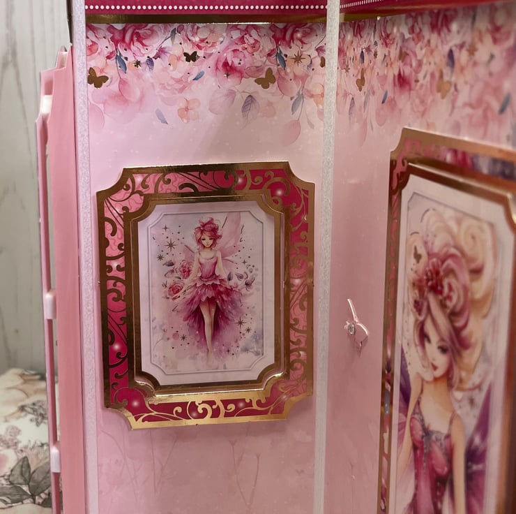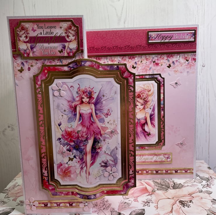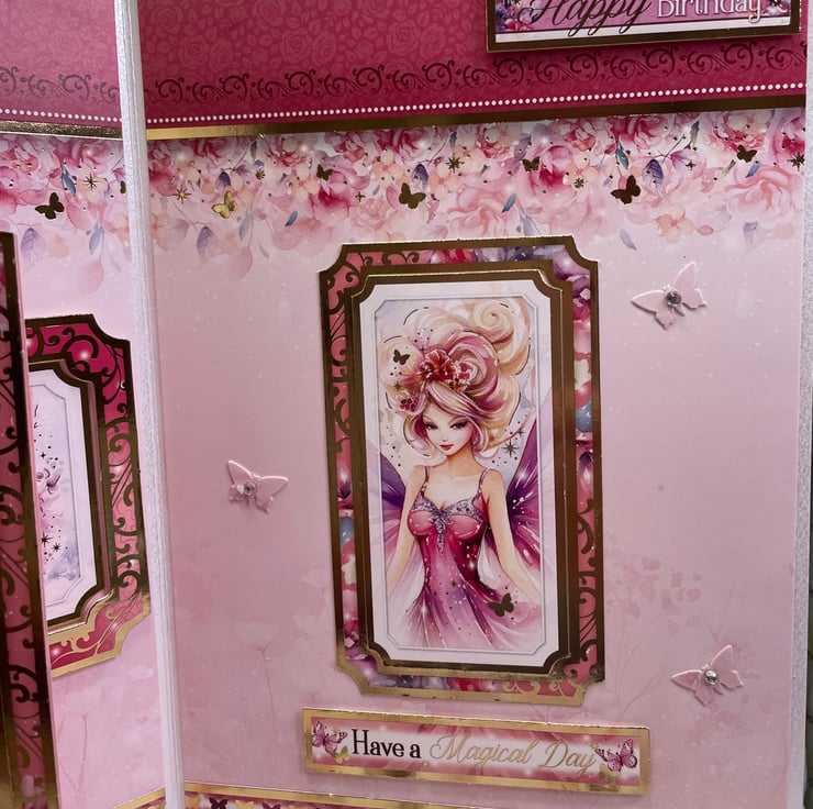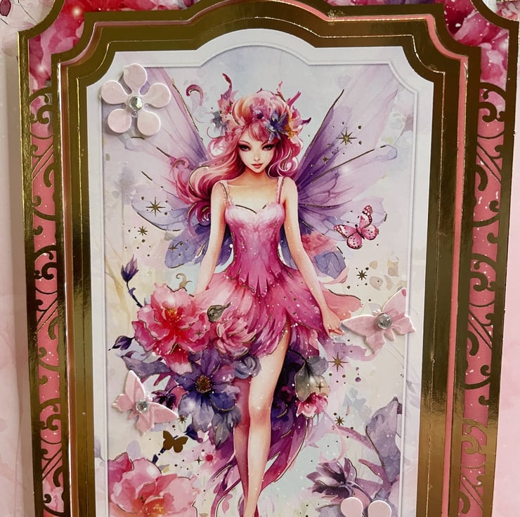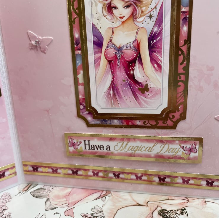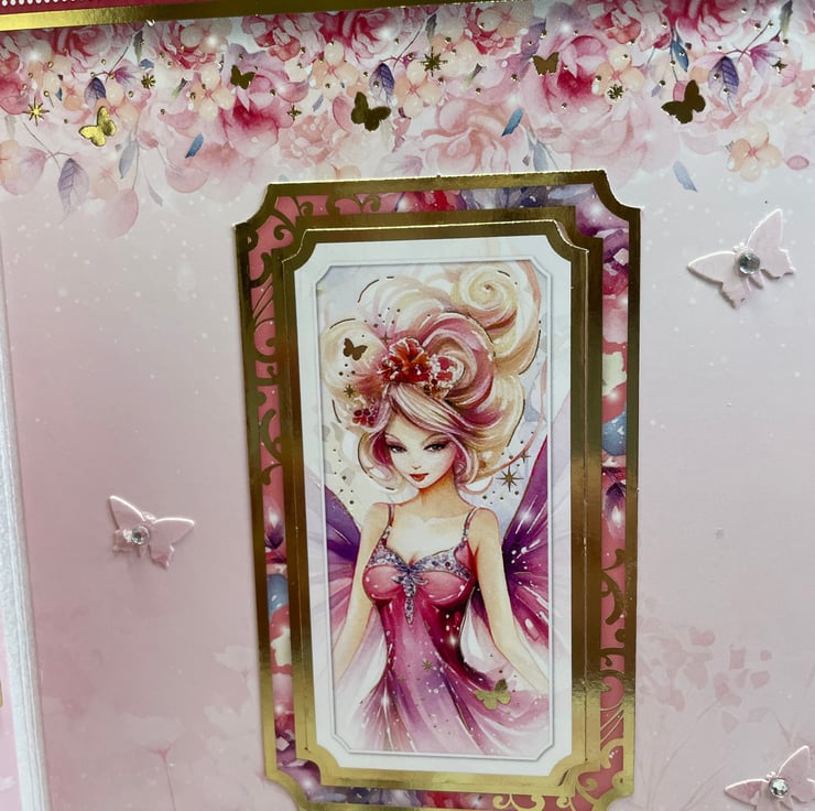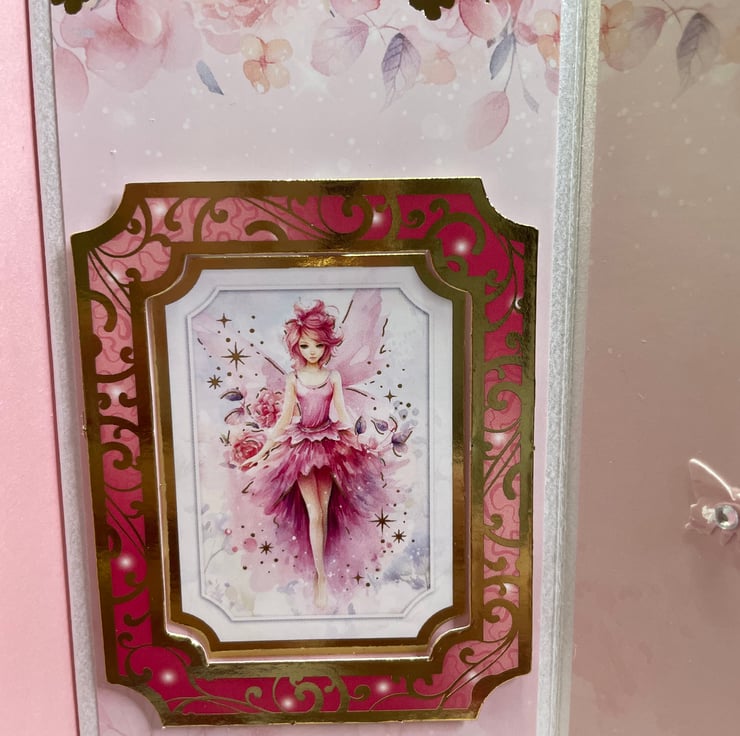 Z fold card in pastel pinks and florals backing card. Main topper pretty pink fairy on a gold frame. Flowers and butterflies with diamanté centres. Message ‘You leave a little sparkle wherever you go’. A smaller framed fairy on the first fold. Main inside panel a pretty framed fairy with butterflies and flowers. Messages ‘Happy Birthday’ and ‘Have a magical day’ . Measures 8.25” x 5.75”. White envelope included.