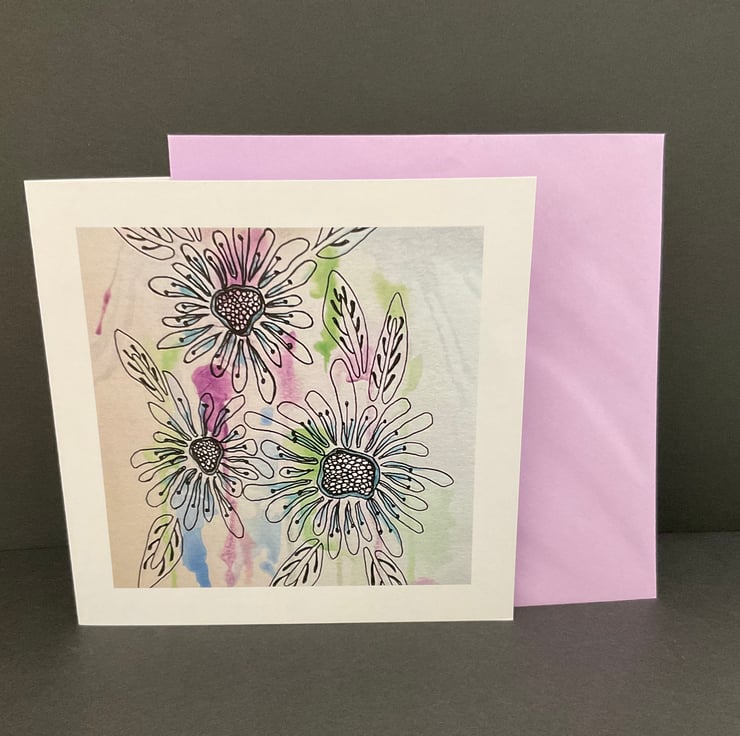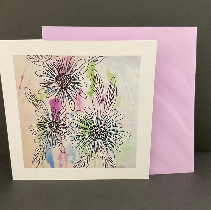 This card is an original watercolour and ink painting of daisies ,with a modern twist .The card measures 142x142mm and is printed on 300gms matte card with a silk finish .The card is blank inside for your own message ,and is presented with a complimenting coloured envelope and protected with a removable cellophane sleeve