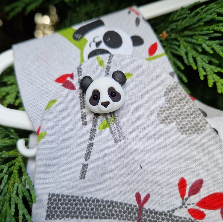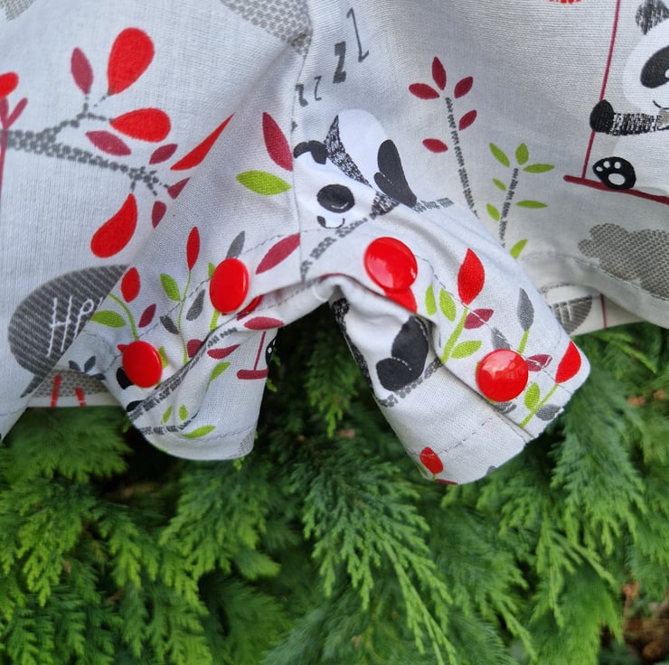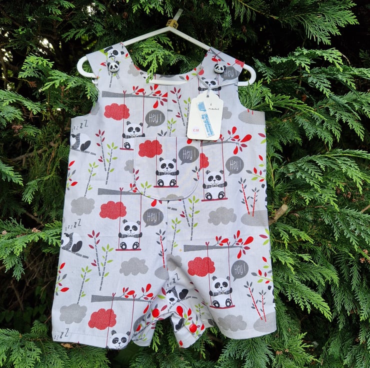 Age 6m approx, pair of silver grey rompers with a print of pandas on a swing, snoozing pandas and with red and grey clouds and a centre feature chest patch pocket detail, with plastic panda head shaped buttons and red poppers at the gusset for easy opening for nappy changes.