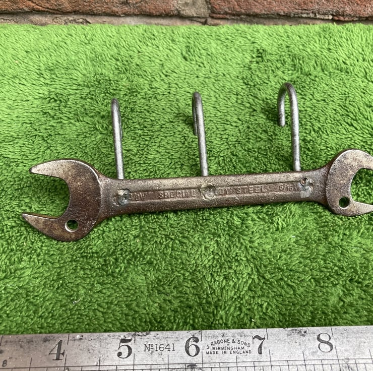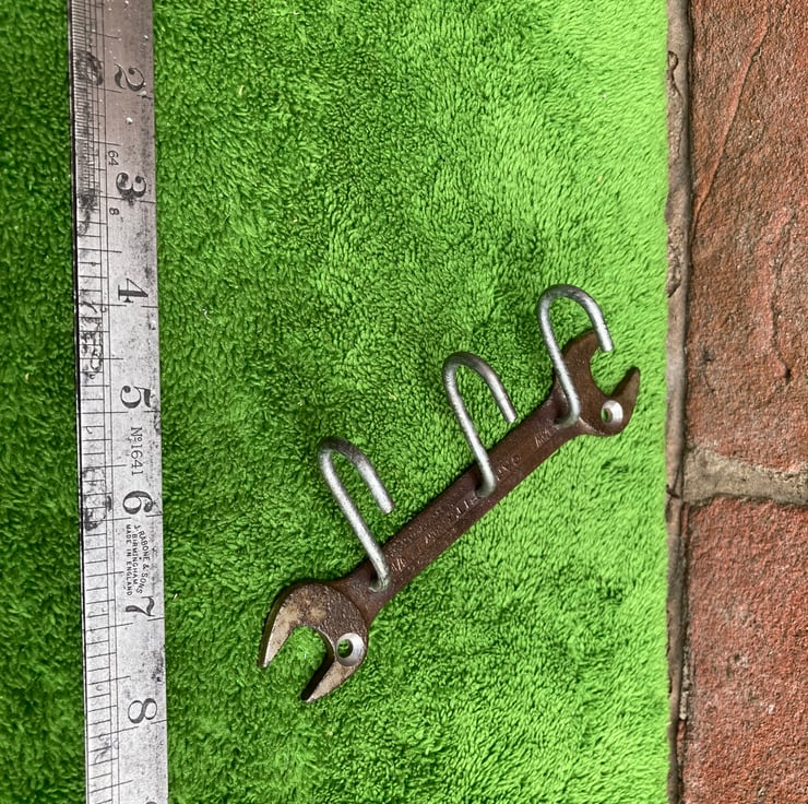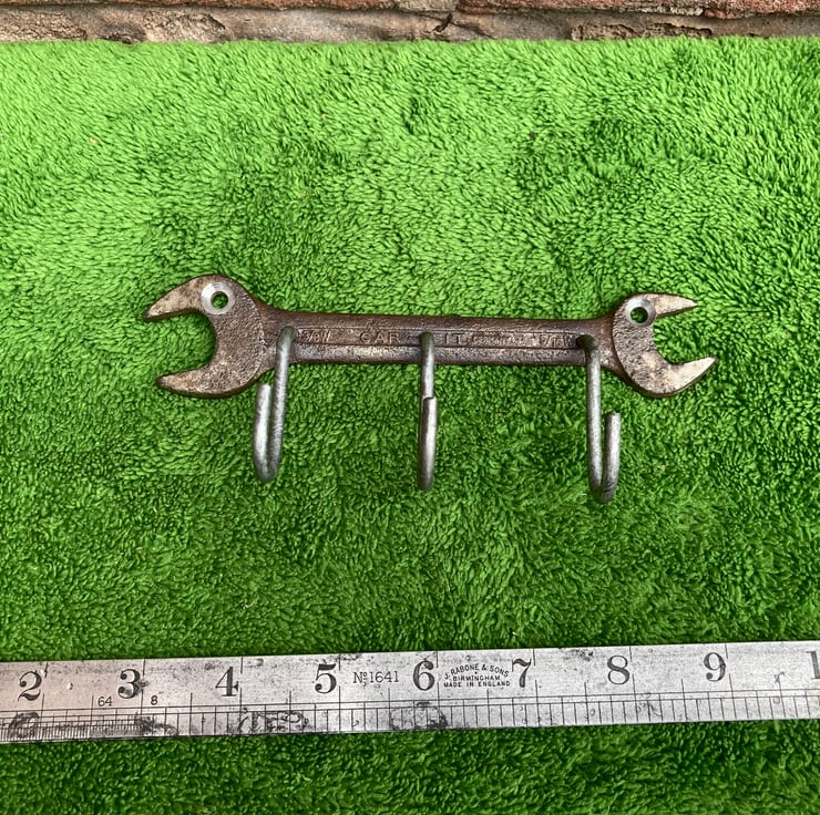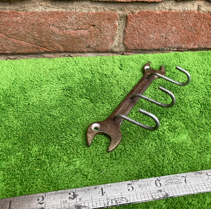 An ideal gift for the engineer in your life, an innovative set of three key hooks mounted onto a quality German vintage Car-Fit brand Whitworth spanner dating back to around the 1950s. The spanner, or wrench, has had three curved hooks mounted onto it by drilling through and welding at the rear. Two further 5mm diameter countersunk mounting holes are provided so the unit can be mounted onto a door or wall. I have treated the assembly with beeswax to preserve it and seal in the patina.
