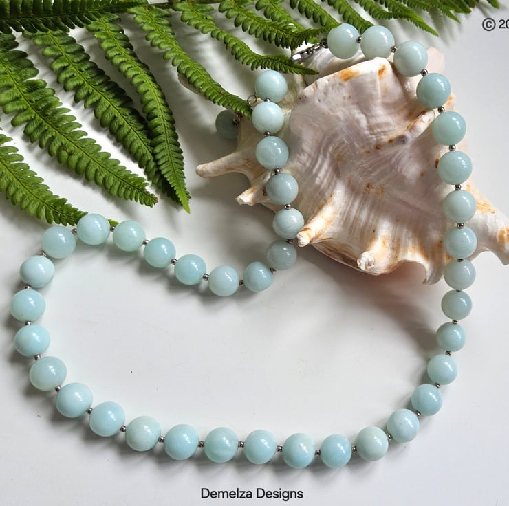 Between each 8mm natural round gemstone bead is a 2mm sterling silver spacer bead adding sparkle and opulence to the piece. For the main construction professional coated stainless steel jewellers wire has been used for added strength and lasting durability, finished off with a quality sterling silver clasp and crimp covers. The connector end has a decorative sterling silver small drop chain with a 5mm amazonite rounds. This provides a decorative finish to the back of the neck for ladies with short or long hair worn up.