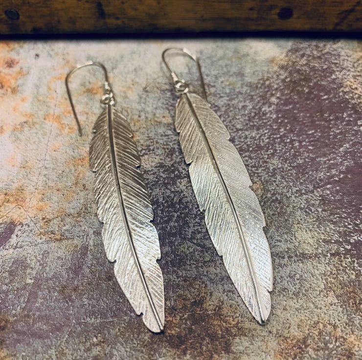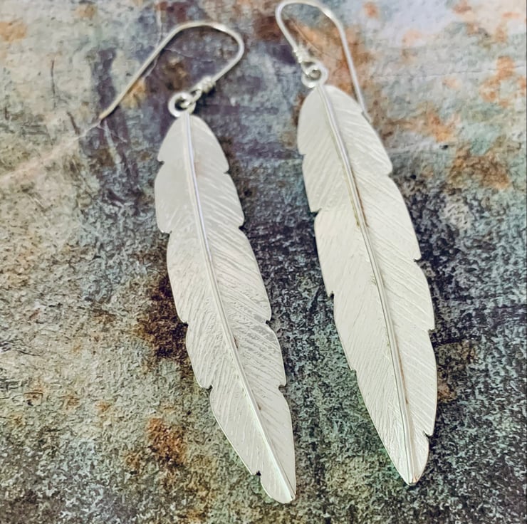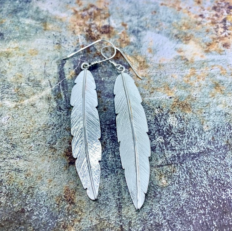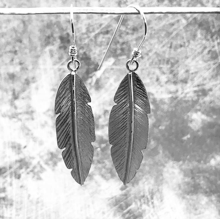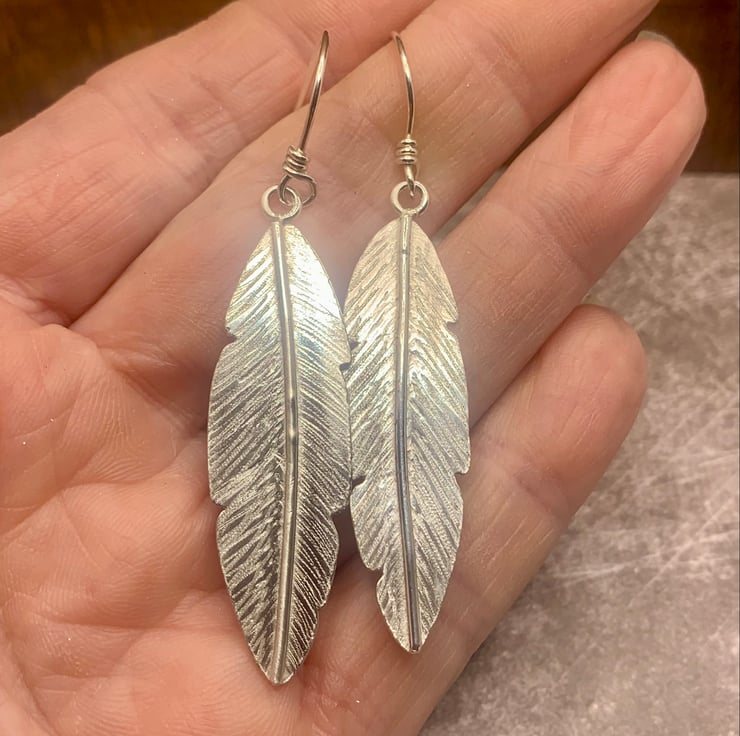 Rustic Sterling Silver Earrings with engraved feathers all made by hand using traditional methods