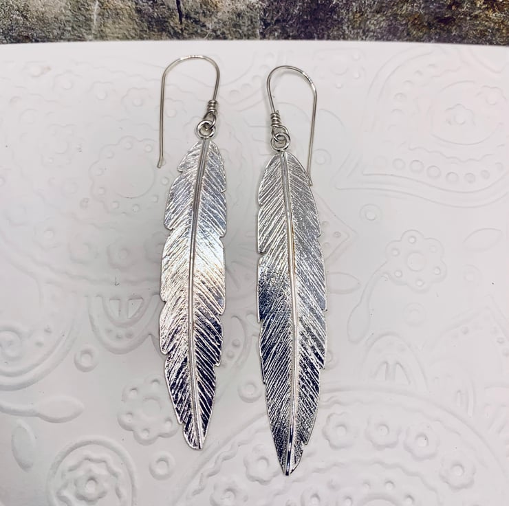 there are two length of feathers to choose from the longer earrings are just over 60mm long but with the ear wires they hang 80mm and at the widest 11mm and the shorter earrings are 40mm but with the earwires hang at 60mm