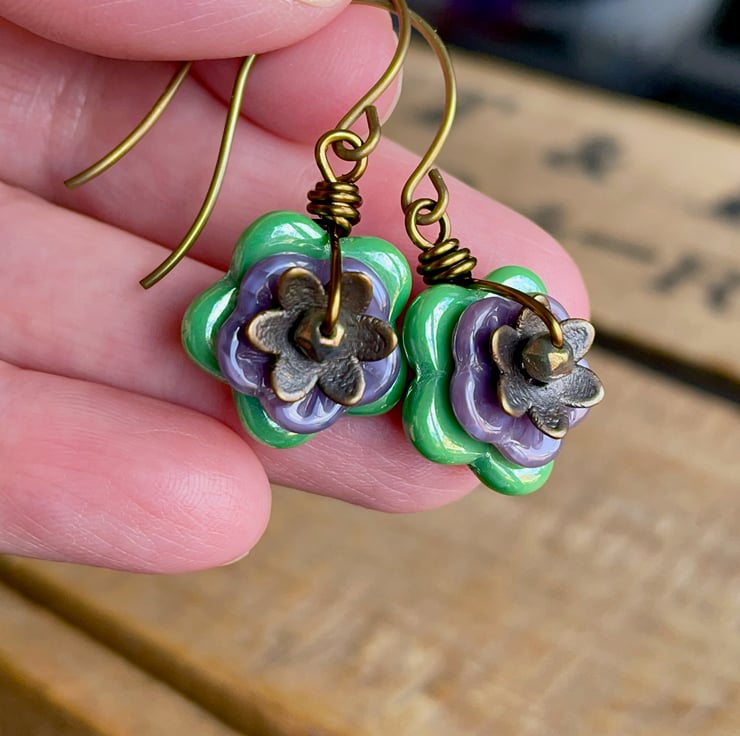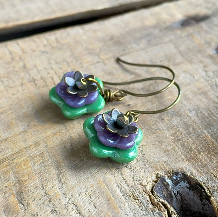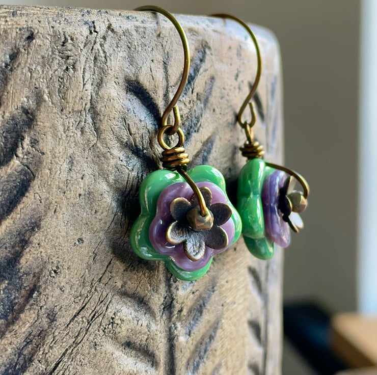 Green & Lavender Floral Earrings. Colourful Czech Glass Flowers. Spring Inspired