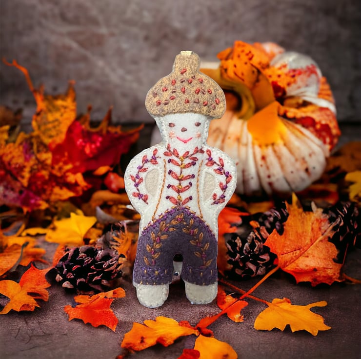 This unique acorn man hanging decoration is the perfect autumn gift It was made in ‘The Egg ‘ ( see my bio) using my own pattern and free style embroidery ideas. I have used the beautiful autumn hues of brown, gold and heather.