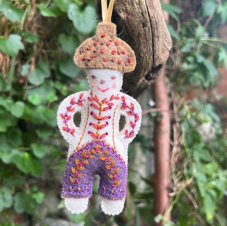All of my makes are eco friendly and made to last from 100% wool felt and stuffed with washed wool fleece sourced from Yorkshire. I use DMC cotton thread to embroider folk patterns and stitches creating totally unique heirloom treasures.