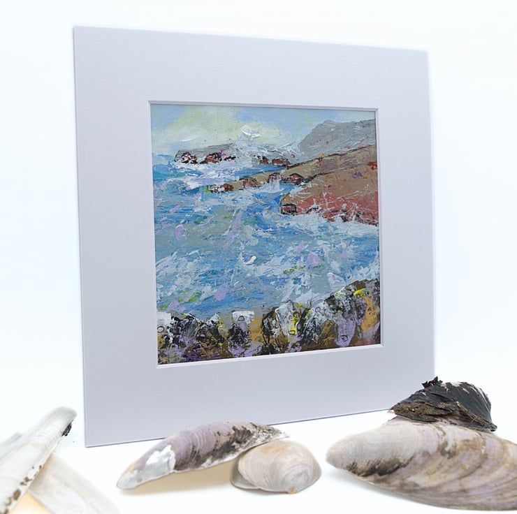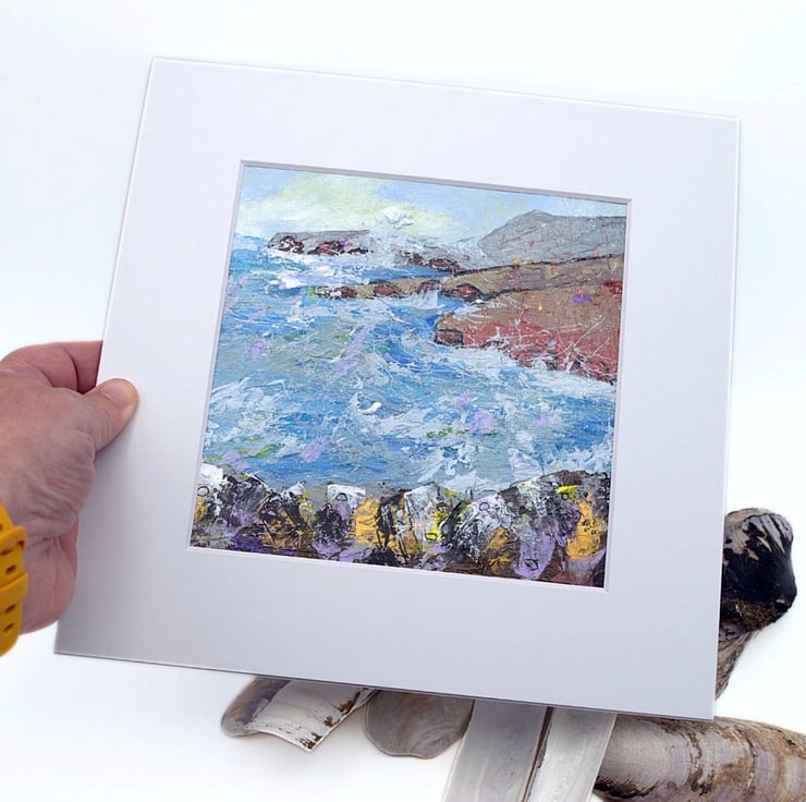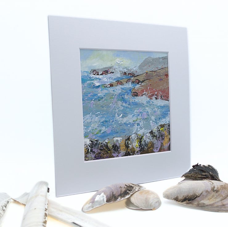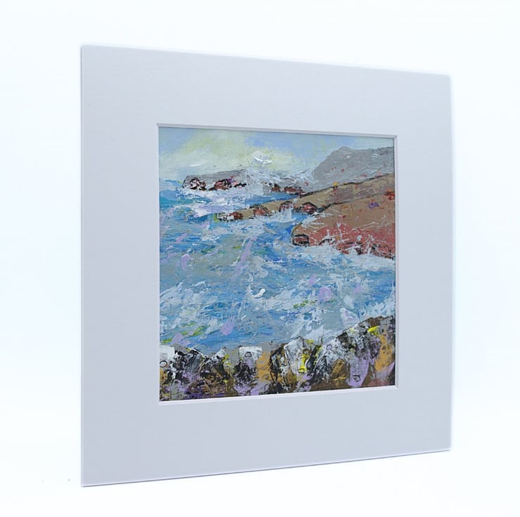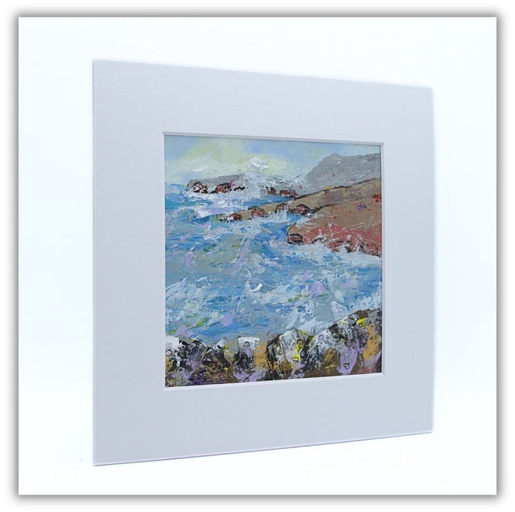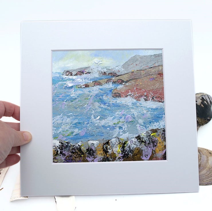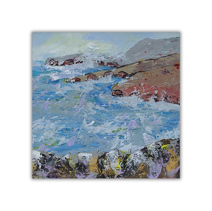 This is an original coastal landscape painting. The seascape is mounted and varnished. The sea is choppy and the white sea spray lashes against the cliffs. The water has been painted in cool, sea blues, lilacs with a touch of yellow, reflected from the sky. The land has been painted in earthy, rustic tones to contrast with the sky and the sea. I have used a range of brushes and painting knives to complete this original acrylic painting.