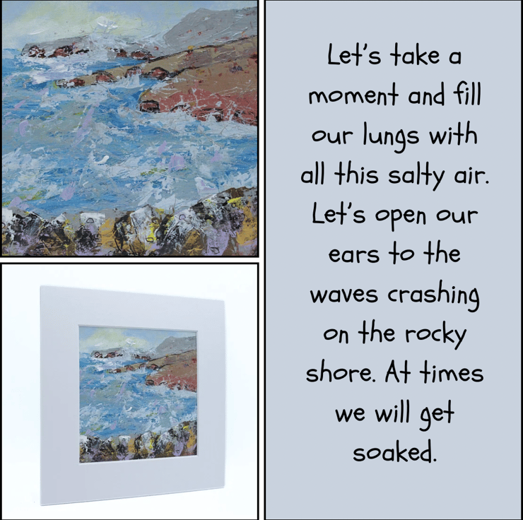 (64) This original painting is called, 'At Times We Will Get Soaked.' The draw of the cool, blue sea is irresistible at times, but be prepared to get wet if you stand too close to the cliff edge. This would make an ideal gift for any occasion.
