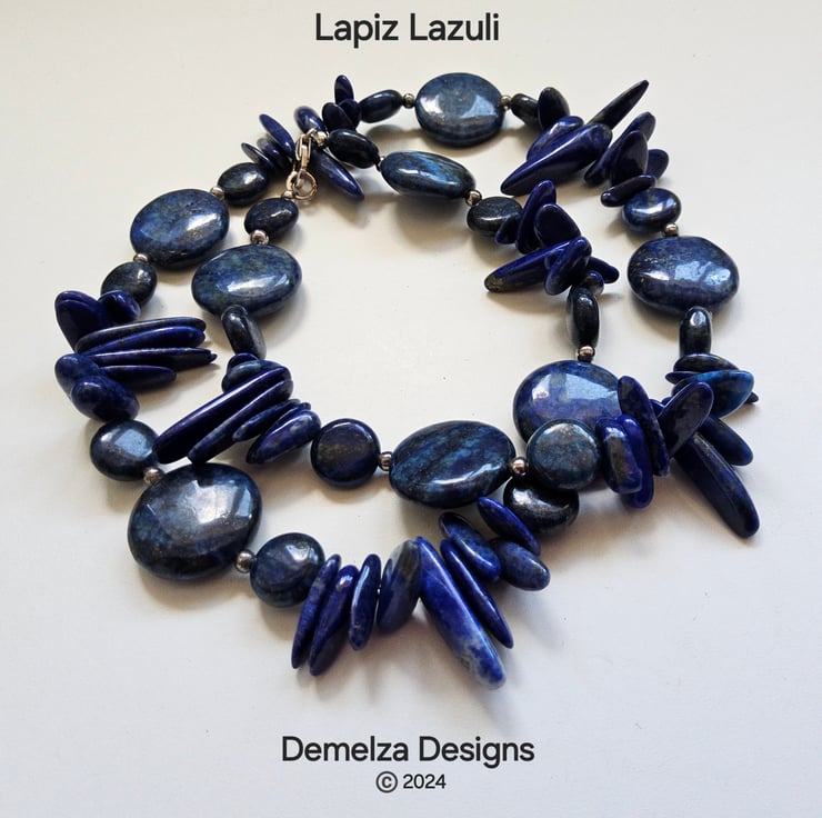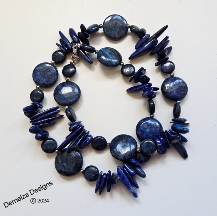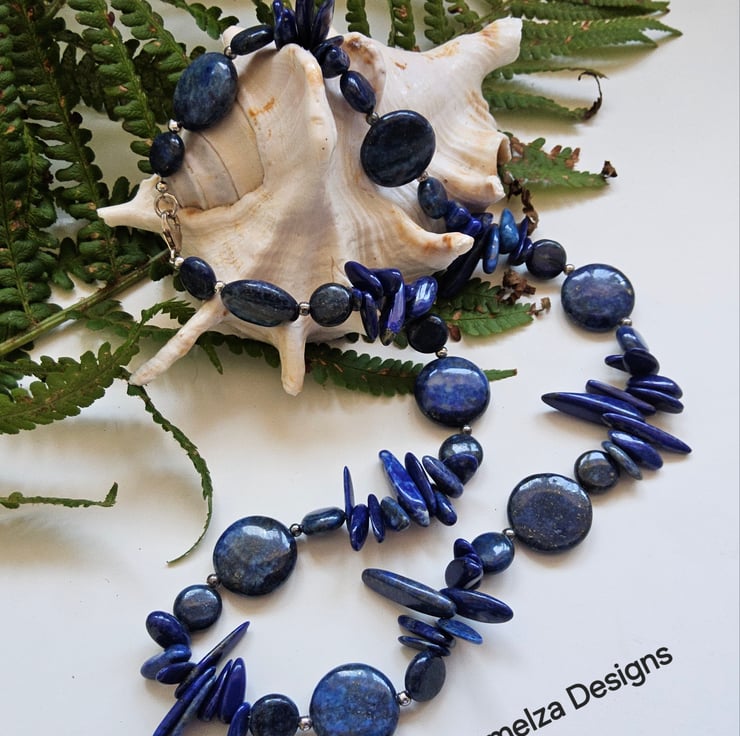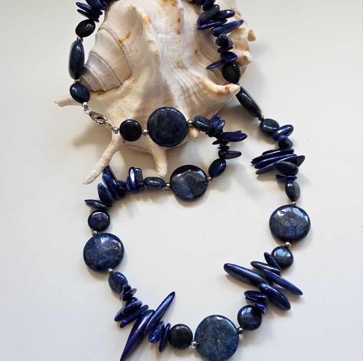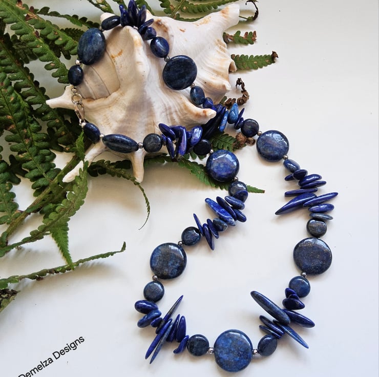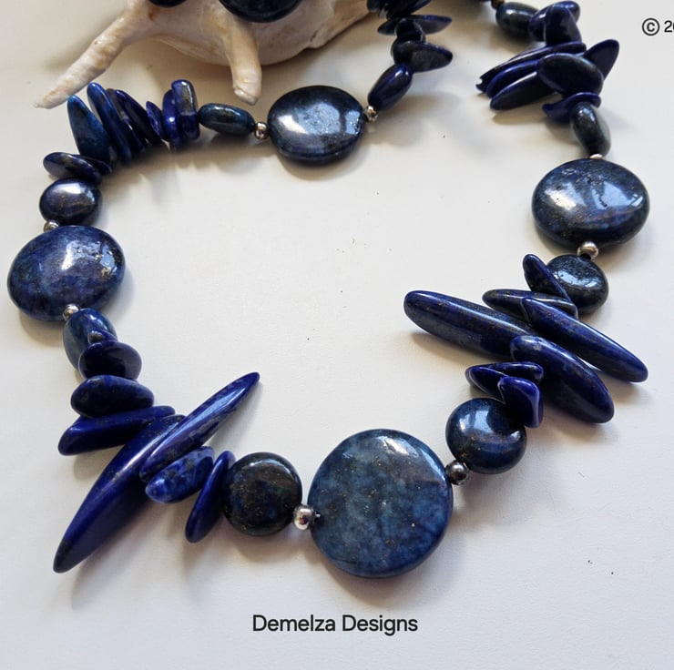 This stunning organic looking necklace has been made from quality lapis lazuli irregular long tooth, flat 15mm and 10mm coin cut gemstones with 925 sterling silver spacer beads within the design. The necklace has been constructed using flexible professional stainless steel jewellers wire for addeded strength and lasting durability, finished off with a 925 sterling silver clasp. It would be the perfect gift for ladies of all age group and skin tone.