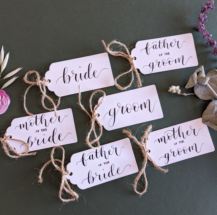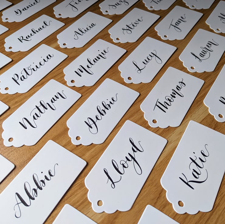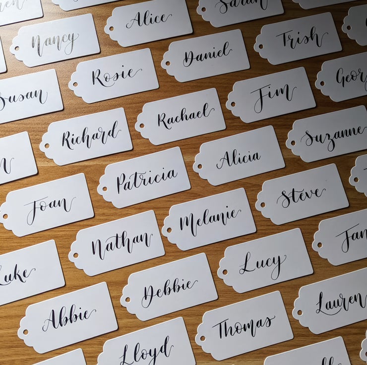 50 beautifully handwritten personalised place card names. Written in black ink as standard but other ink colours available so please do ask if you would rather a different ink colour. These can be finished with twine or left empty for you to attach to favours or other table decor.