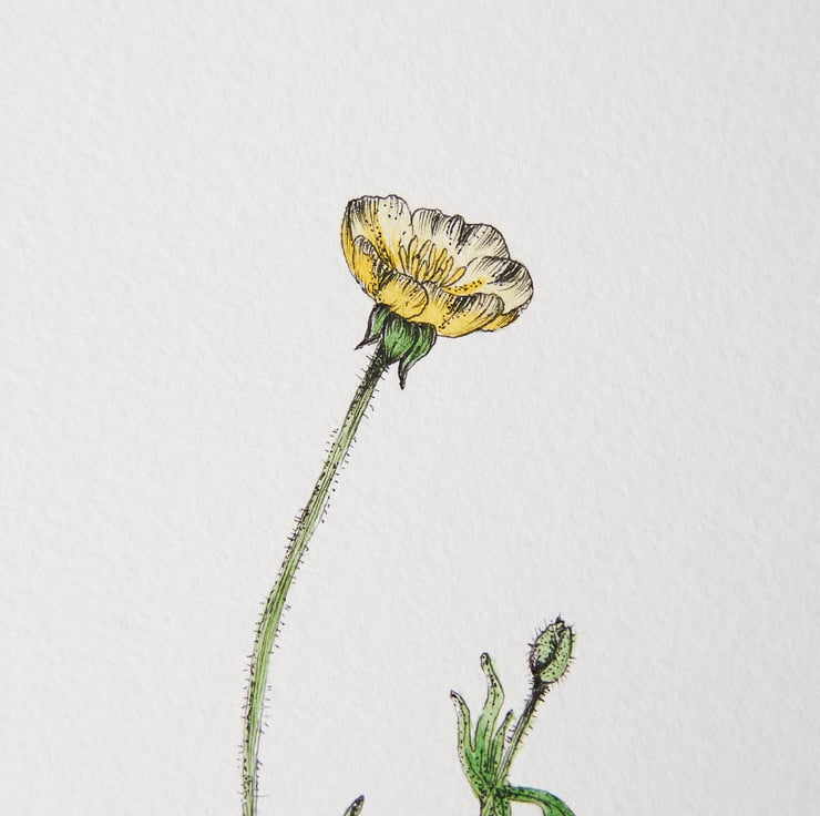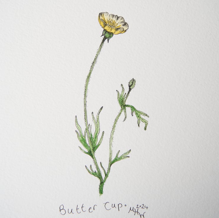 This drawing, entitled “Buttercup” was completed in 2024 and is an original botanical hand-drawn illustration of this delicate and beautiful little flower that pop up in the summer. I have used watercolour to help bring it to life add a little spark of happiness.