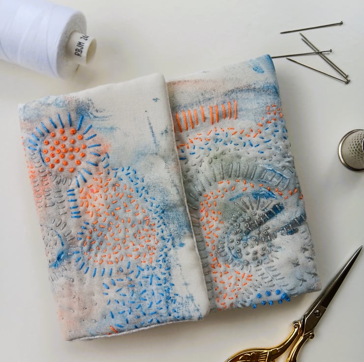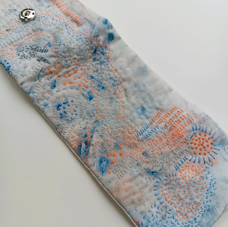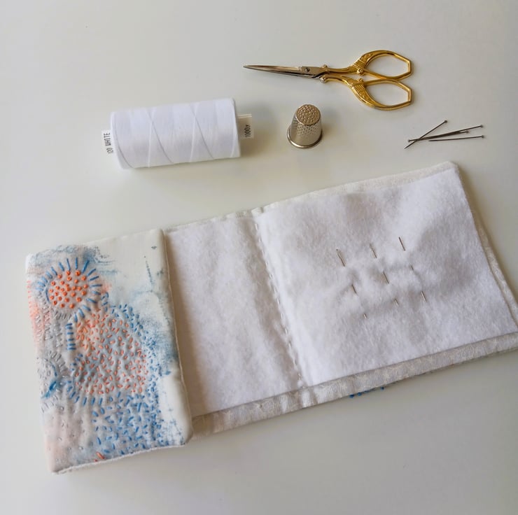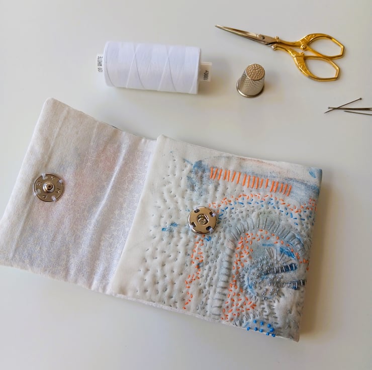 This hand embroidered needle case has been created in my Nottingham home studio using re-purposed fabric and acrylic paints to create unique marks which I then embellish with embroidery.