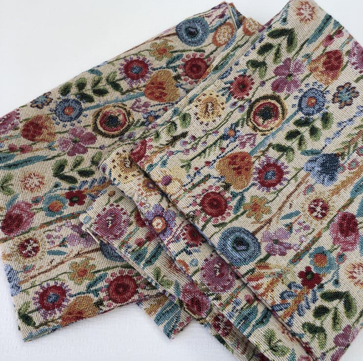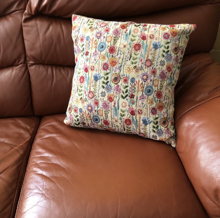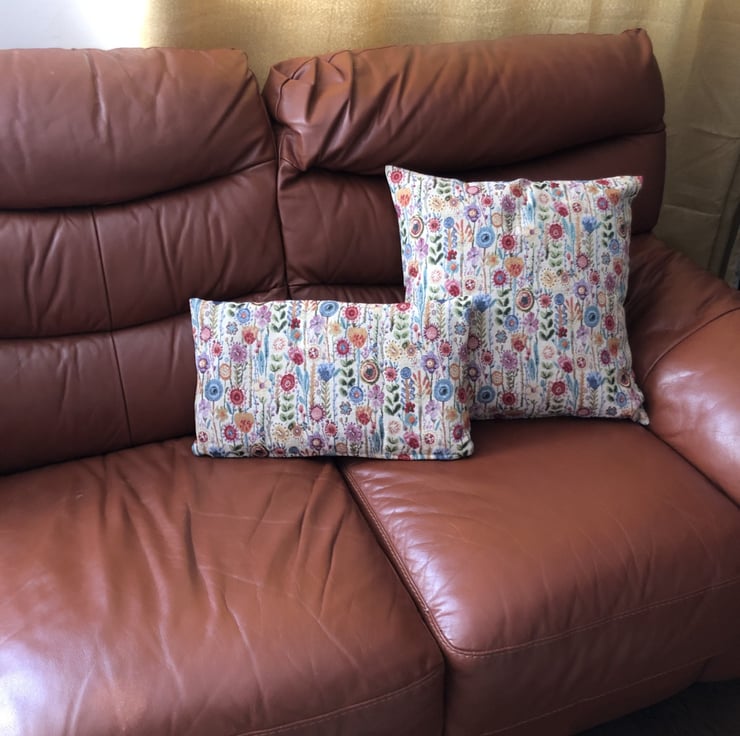 Set of two cushions covers are made with Tapestry fabrics with delicate field flowers. This design help to bring romantic to your space. The smaller one support low back and makes sitting on the sofa more comfortable. Beige zip -18" long was fix on one side. This heavy weigh and high quality fabric has 80 % cotton and 20 % polyester .