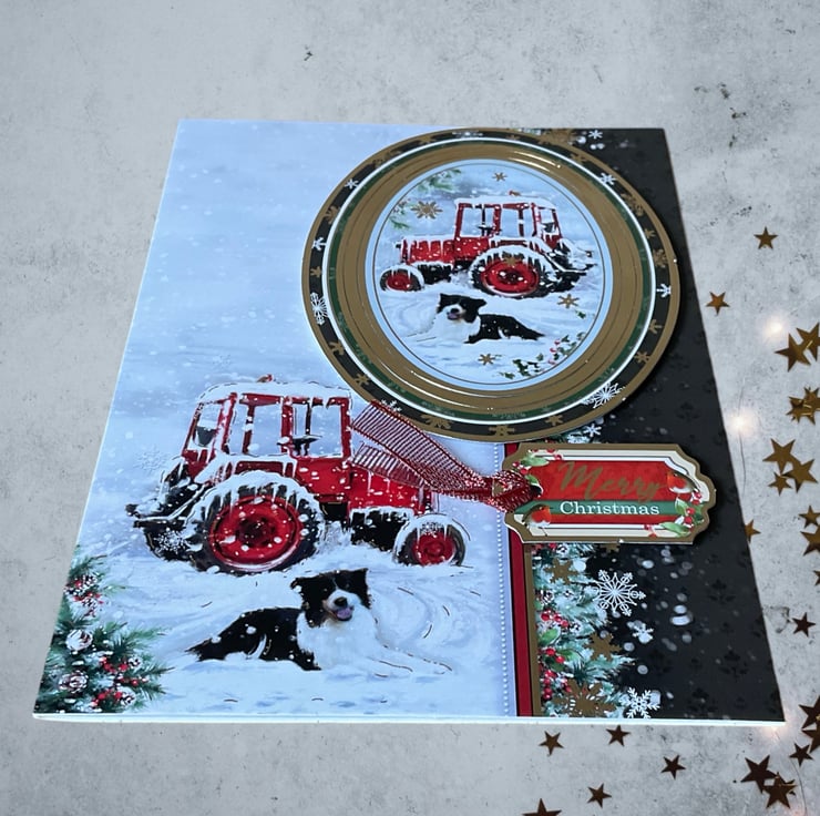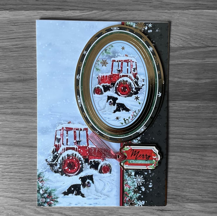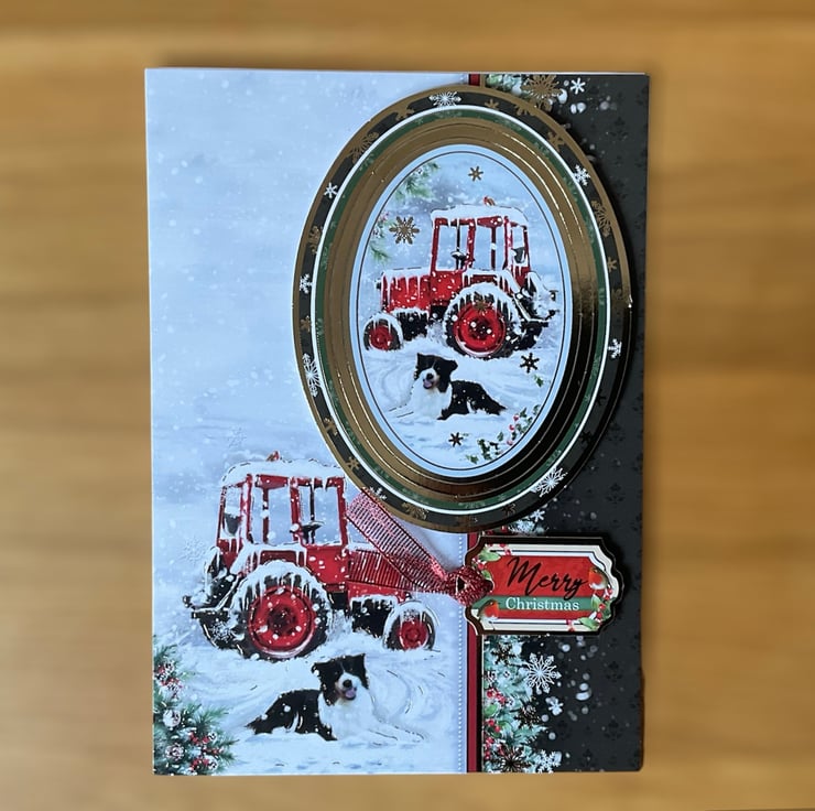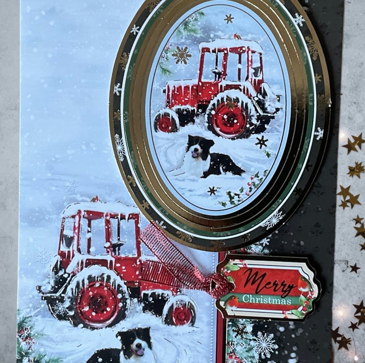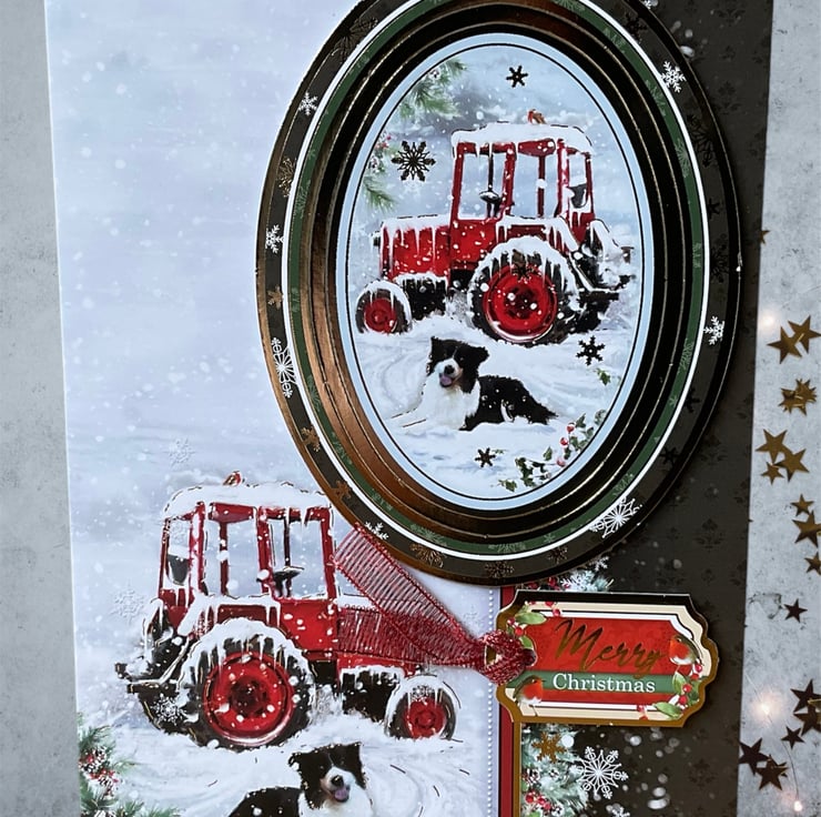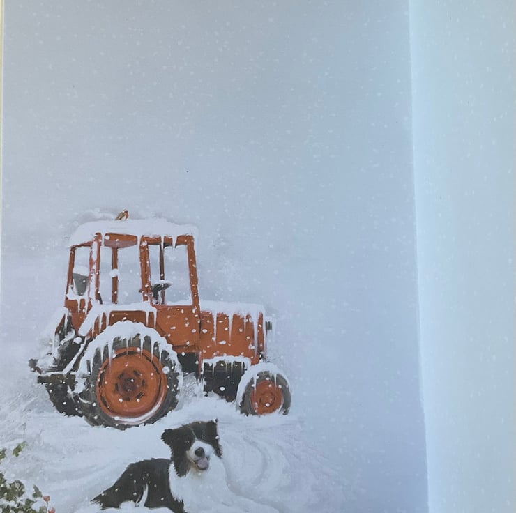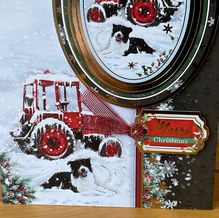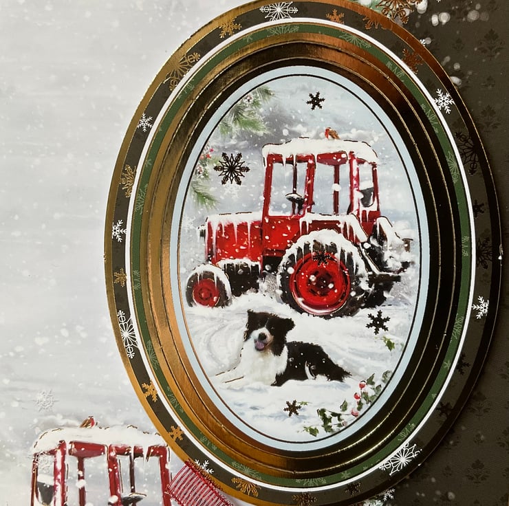 This lovely card has a snowy scene which features a collie dog next to a snow laden red tractor. A coordinating luxury gold foiled topper has been added in 3D. The words Merry Christmas have also been applied.