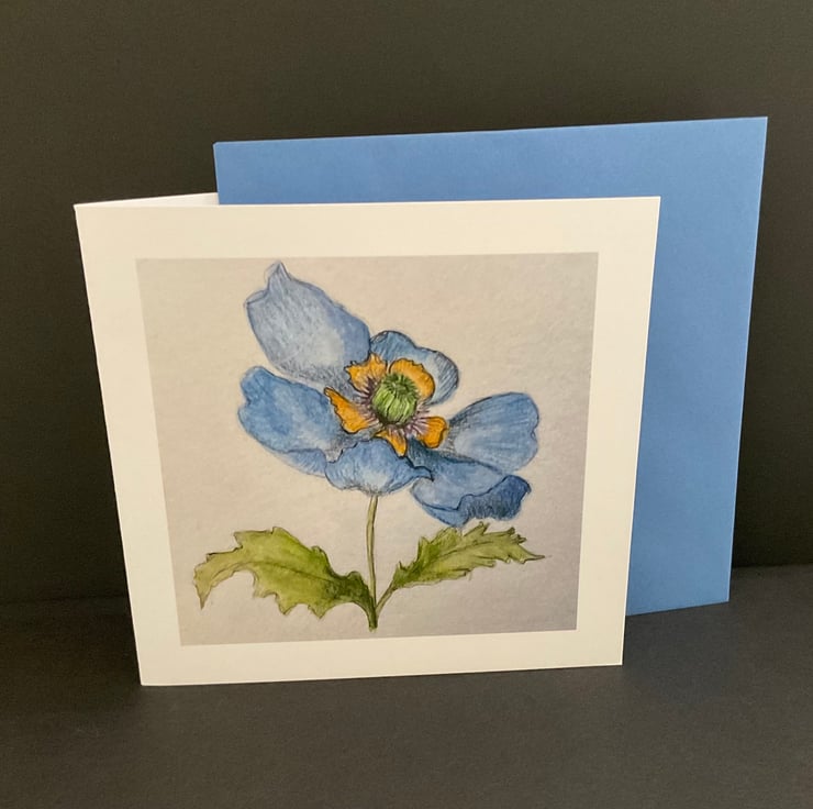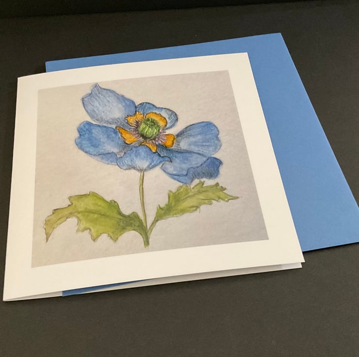 This card is an original watercolour and ink painting of a beautiful Himalayan Poppy ,The card measures 142x142mm and is printed on 300gms matte card with a silk finish .The card is blank inside for your own message ,and is presented with a complimenting coloured envelope and protected with a removable cellophane sleeve