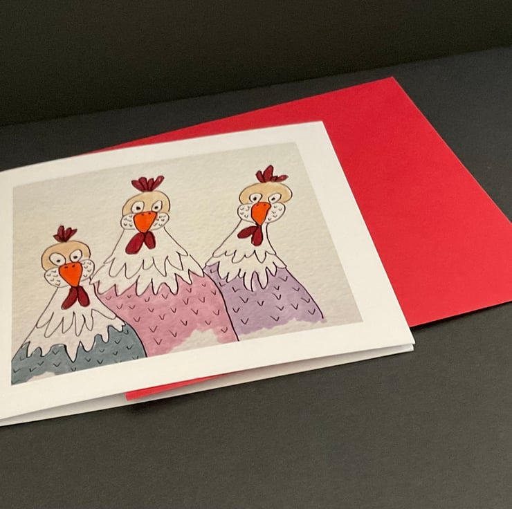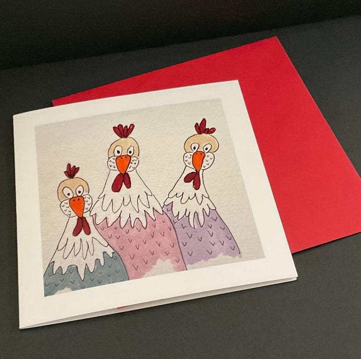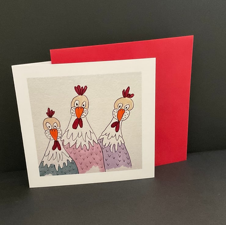 This modern themed card is an original watercolour and ink painting of three funky chicken