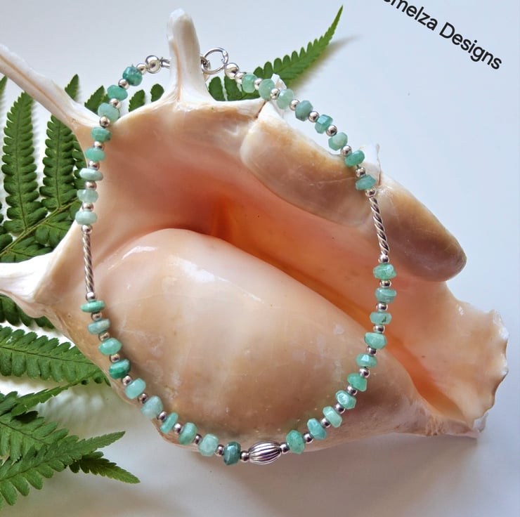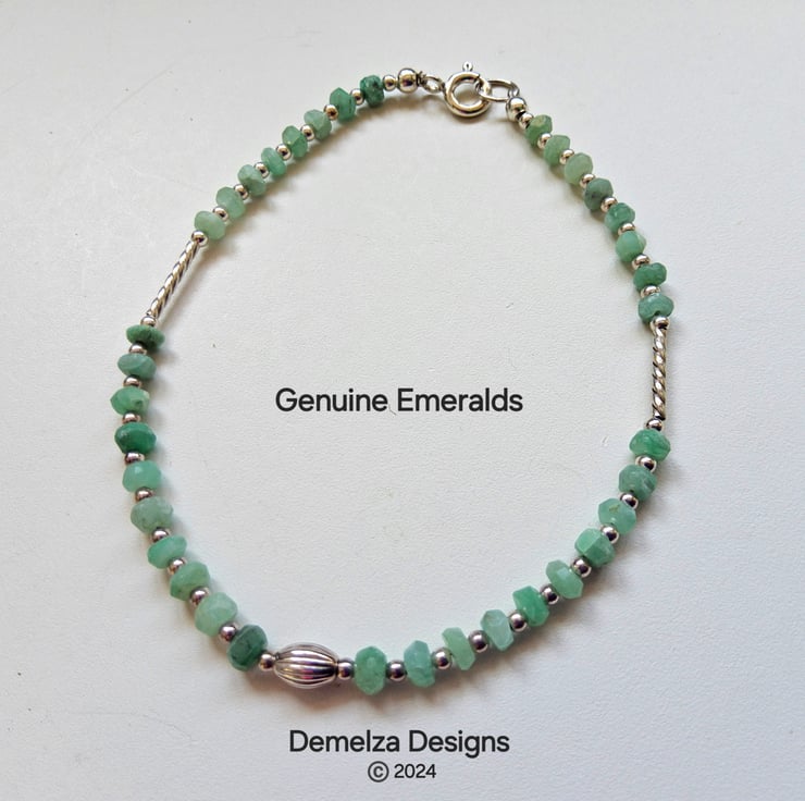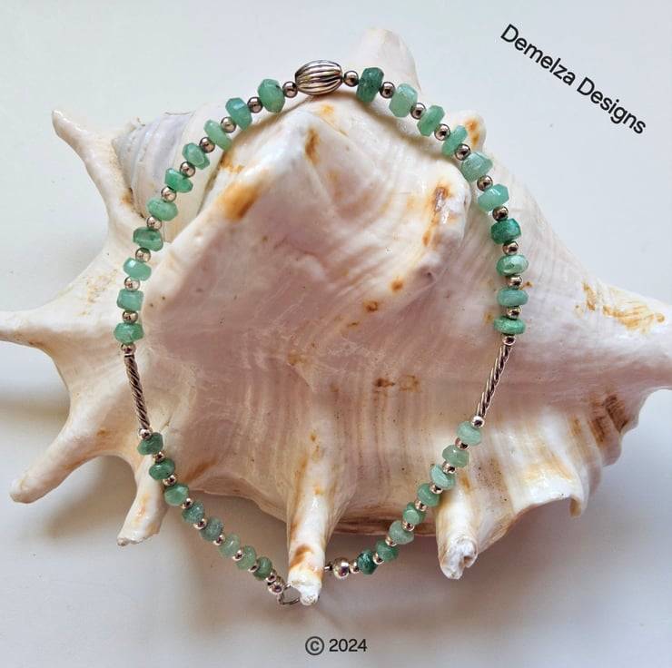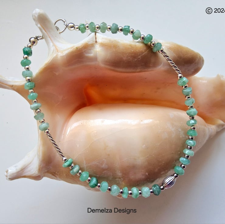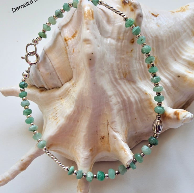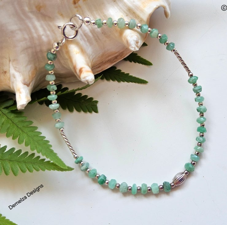 A gorgeous dainty feminine looking bracelet designed and hand crafted in Cornwall using quality free faceted emerald rondelles from Zambia. The bracelet has a central sterling silver rice beads with 2mm sterling silver spacer beads complimented with twisted design sterling silver tubes.