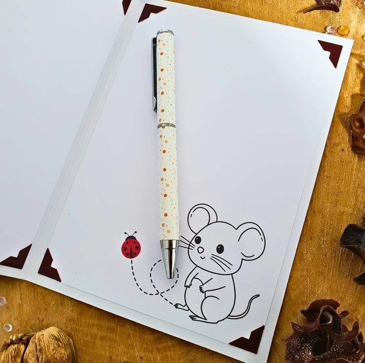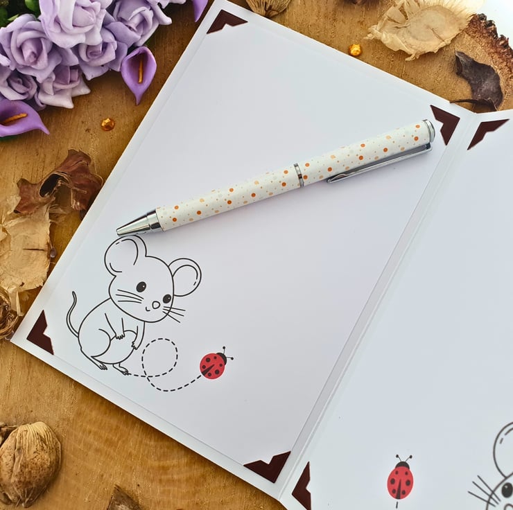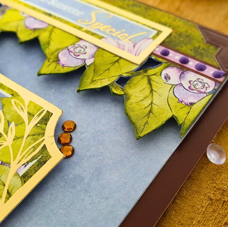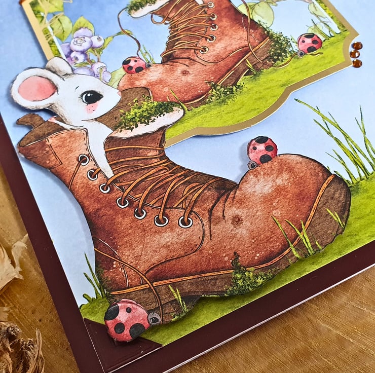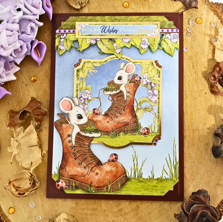 The card consists of mats & layers of brown card & nature inspired printed cardstock. A playful mouse is coming out of an old, brown boot, with a few ladybirds and blueberry plants completing the scene. The sentiment "Sending Best Wishes To Someone Special" rests on a panel embellished with purple colour dots. The card is embellished with craft gemstones & finished with two panels of coordinating inserts, blank, for you to add your own messages and wishes. Decorative photo corners give a unique touch to the card.