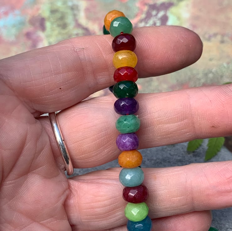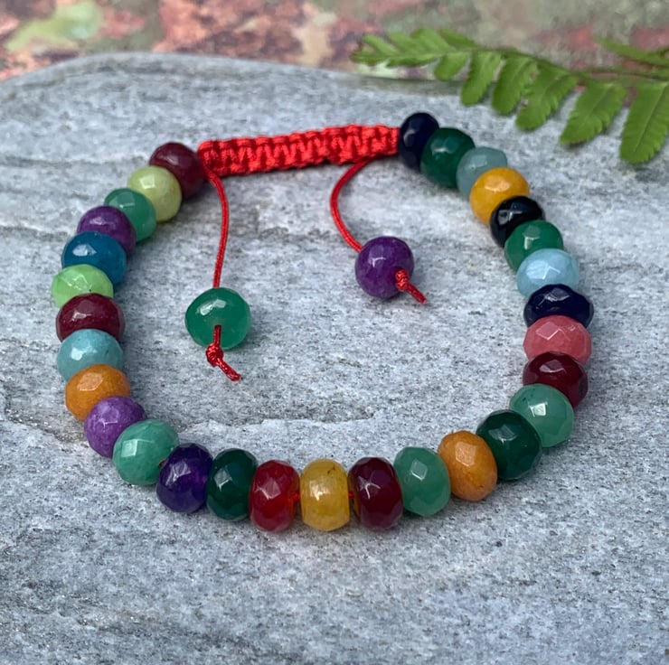 This multicoloured Bracelet is made from a variety of Faceted Gemstone Rondelle beads and threaded onto a Red waxed cord