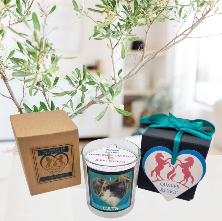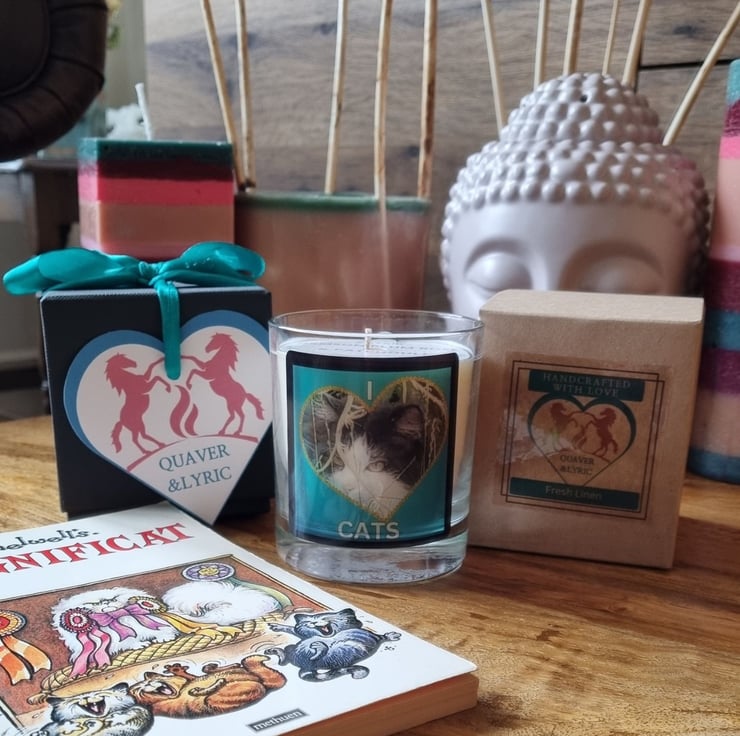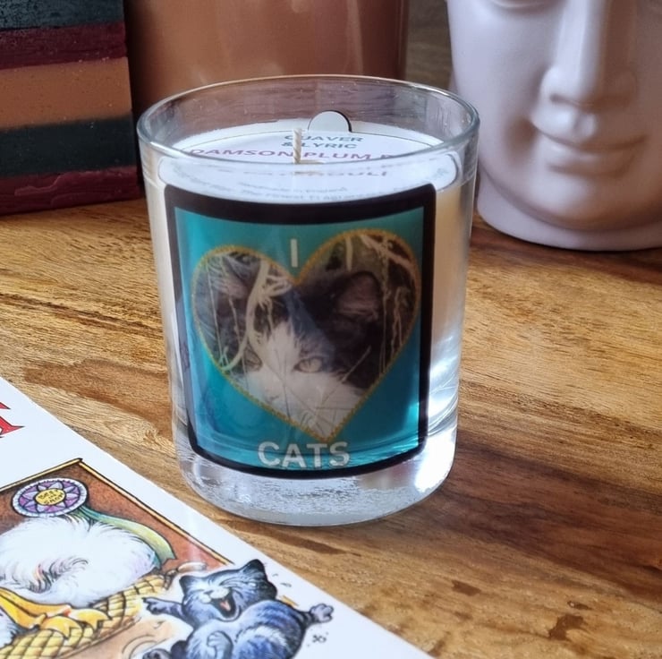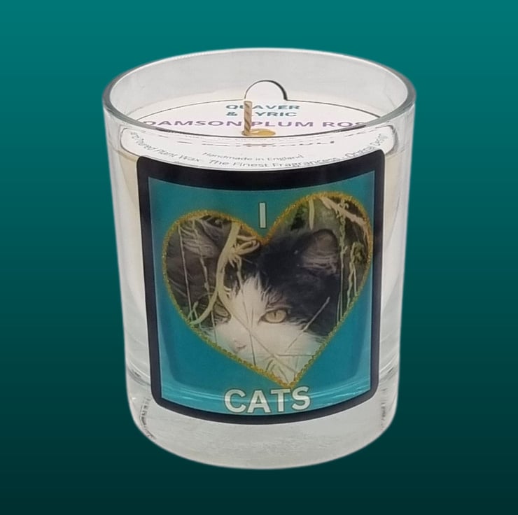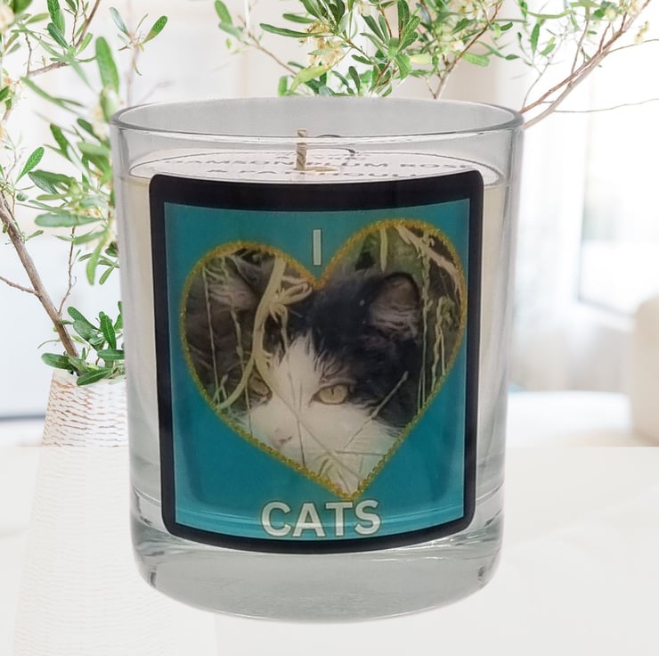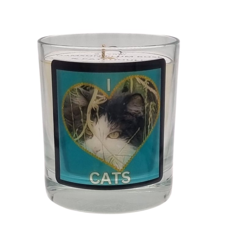 A beautifully scented candle with I love cats design featuring a black and white cat. Handmade in Northants using a quality rapeseed and mineral wax blend and premium fragrances, hand-poured into quality glass containers and supplied in a kraft box. The design on the scented candle is made from permanent printed waterproof vinyl which can be cleaned (hand wash only) allowing the glass to be re-purposed as part of your home decor after the candle has burned.
