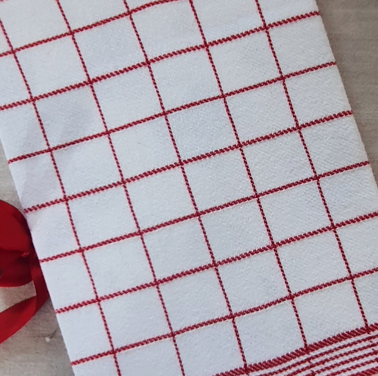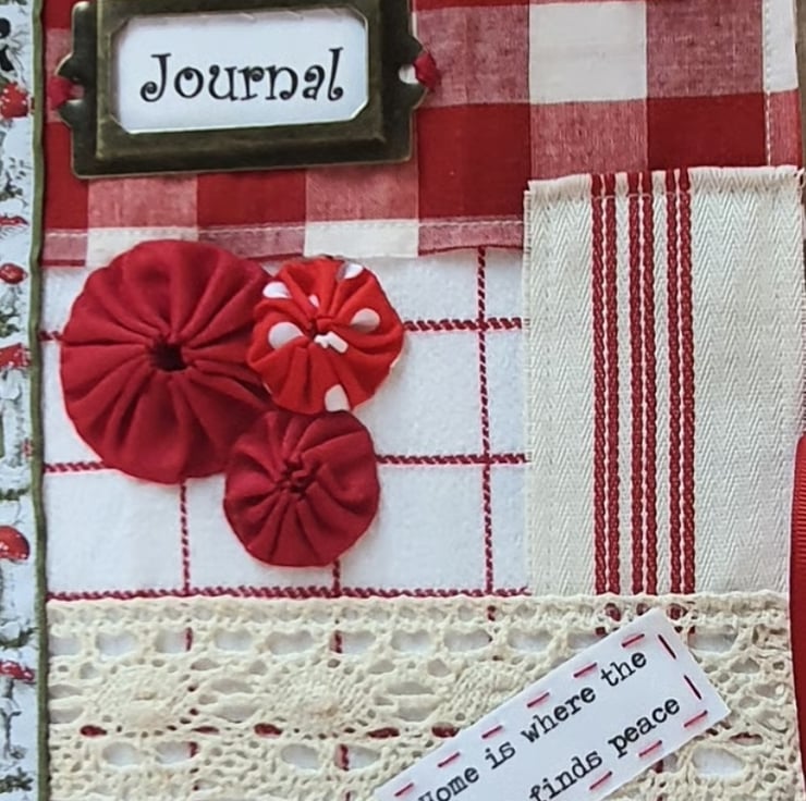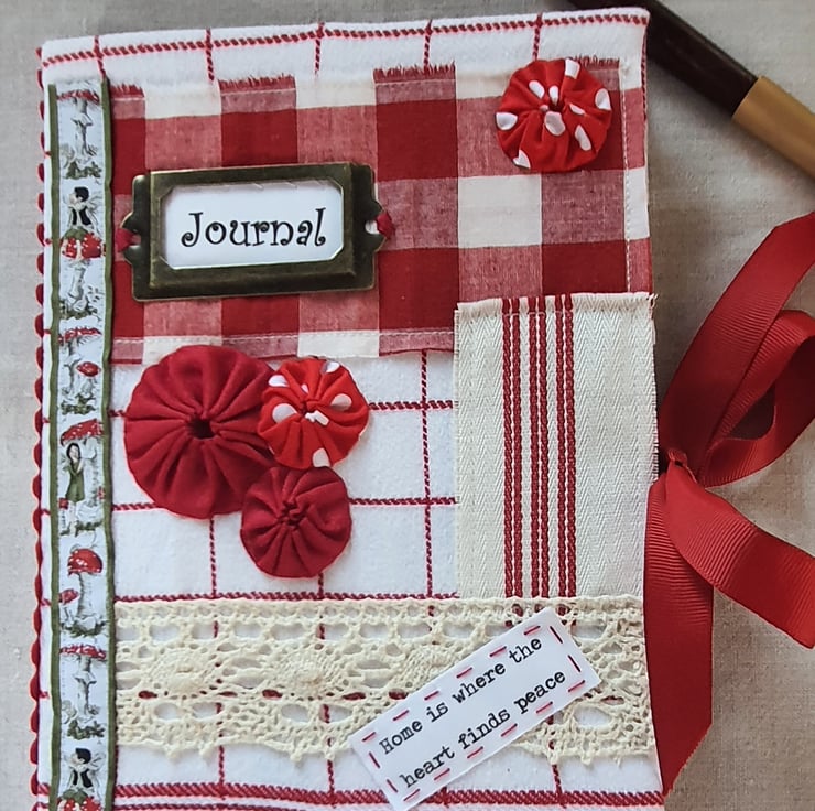This A5 sized journal is covered with a handmade cover, embellished with pretty red fabrics, lace, Suffolk Puffs, and a blank label for you to complete. Ties with a red grosgrain ribbon.