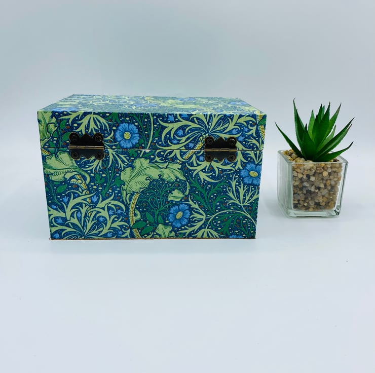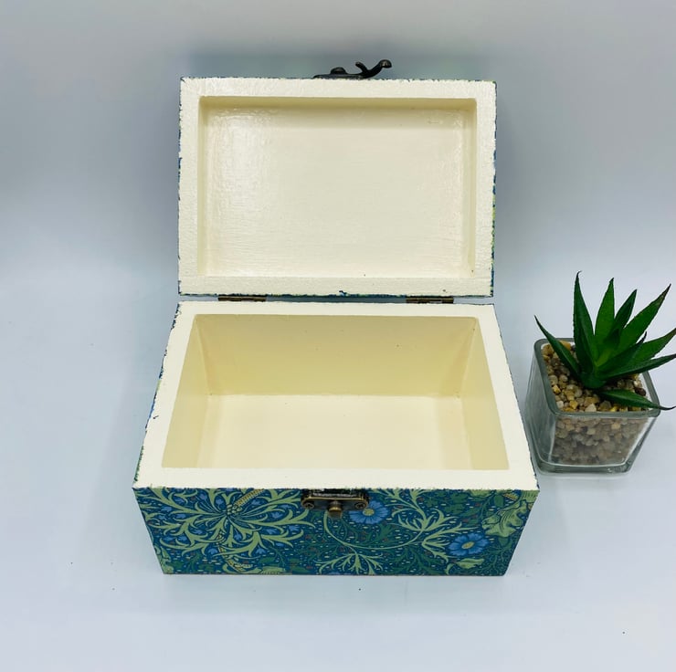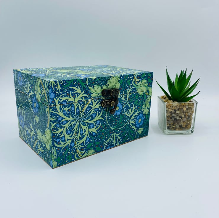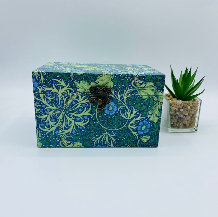 This beautiful, handmade, wooden box has been decoupaged with a paper napkin in the exquisite blue and green Seaweed design inspired by William Morris.