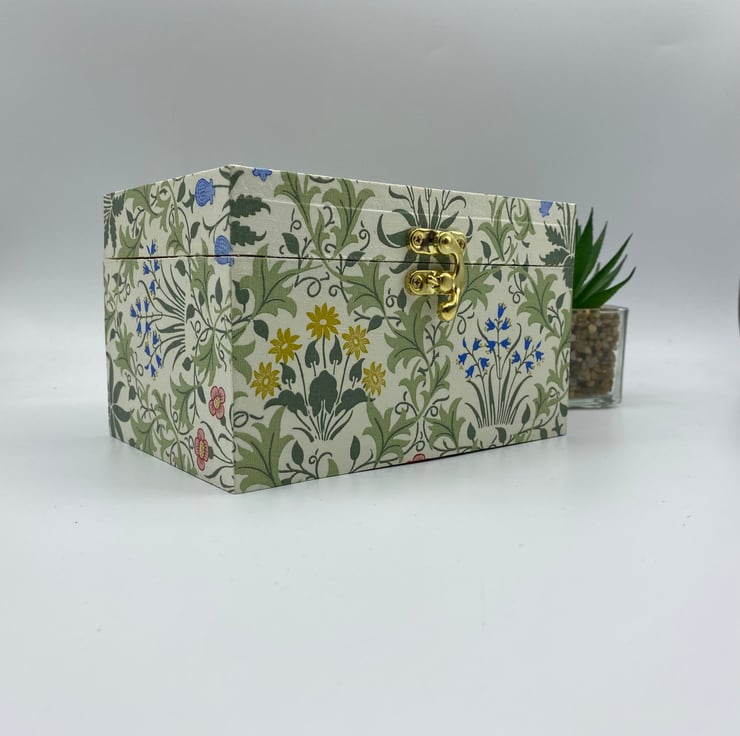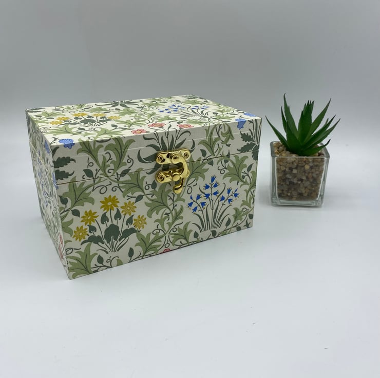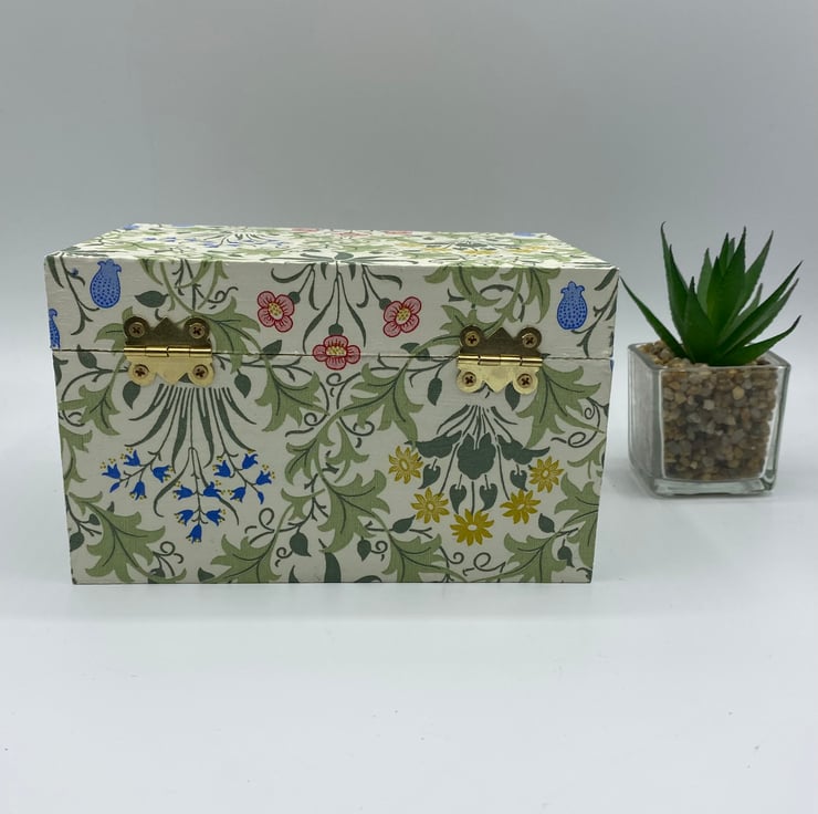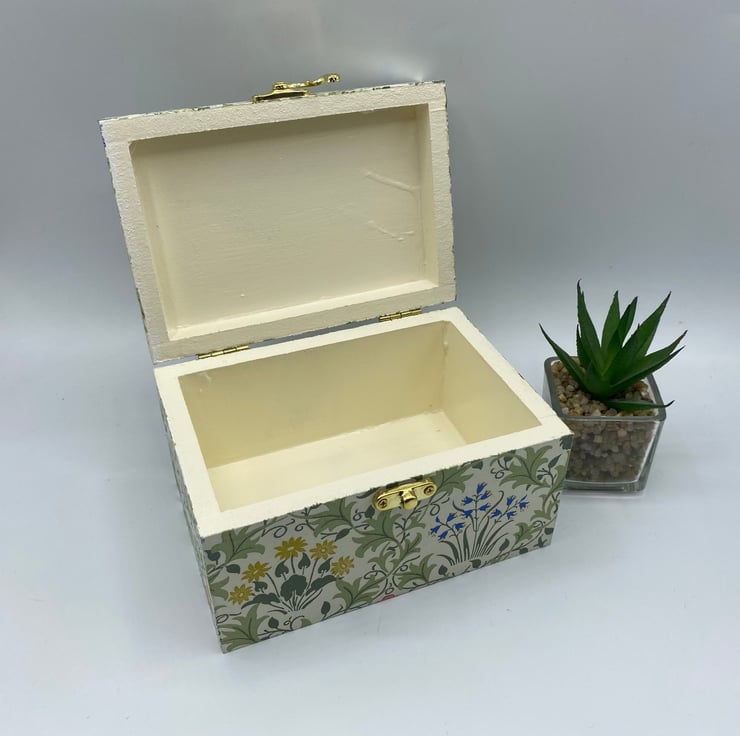 A beautiful, handmade, wooden box decoupaged with paper napkins featuring the gorgeous Celandine design by William Morris.